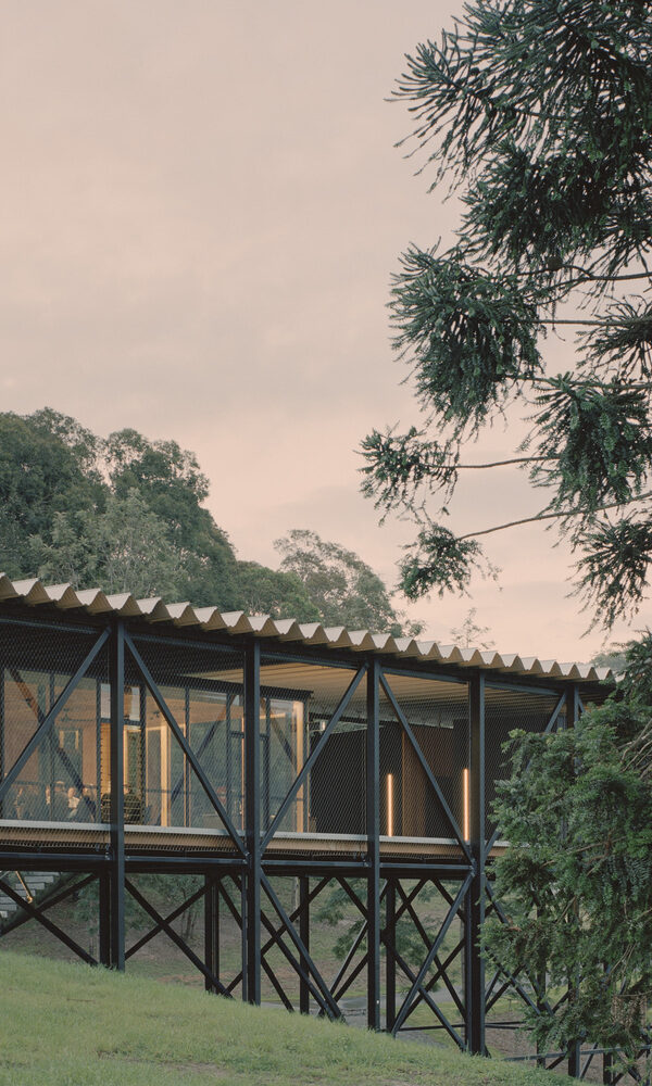 La nueva estructura de Cor-Ten está fabricada a partir de láminas de 1200x2400mm con una sucesión escalonada de puntos de soldadura en los que los huecos de ventanas y puertas se cortan in-situ de acuerdo con los planos existentes. Los paneles de tabiques y cubierta son pre-fabricados fuera y se soldaron juntos en una parcela cerca de las ruinas; la estructura final se instaló con una pluma en un sólo día. El interior -muros y cubierta- están aislados, sellados con una capa de vapor de alto rendimiento y forrados con madera de picea contrachapada para crear una caja de madera dentro de la estructura de Cor-ten. Las escaleras, entreplanta y pasamanos también son de láminas de contrachapado.