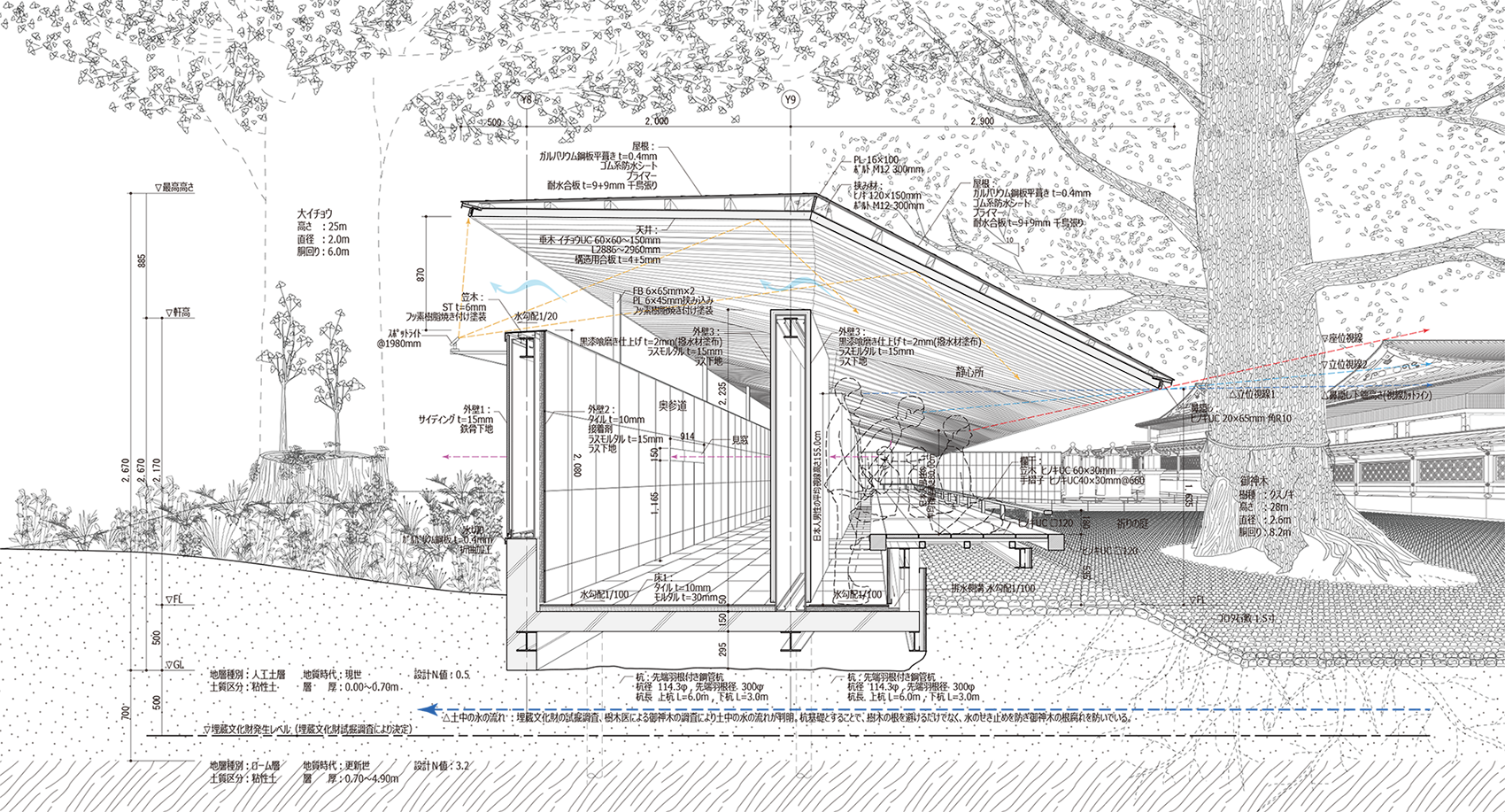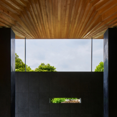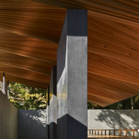 El pabellón no busca protagonismo. Su techo envolvente guía la mirada, atenúa la luz, y acompaña el gesto de cerrar los ojos. Cuando el visitante gira, una rendija revela el tocón del viejo ginkgo, que ha comenzado a rebrotar. La arquitectura no solo resguarda el pasado, también prepara el futuro.