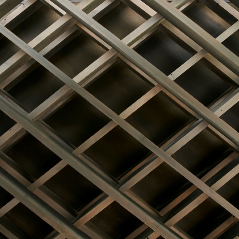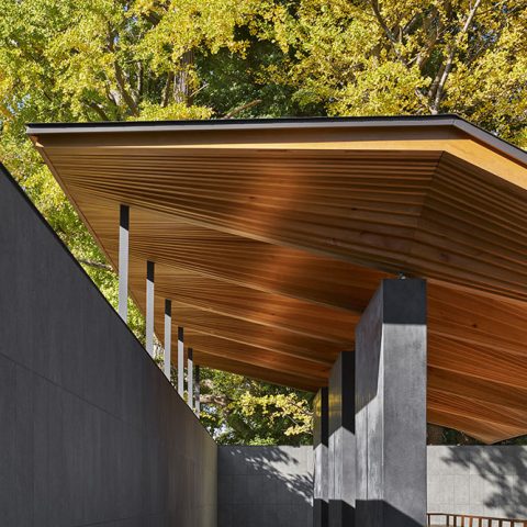 El Meditation Pavilion se construye con madera de ginkgo recuperada del propio árbol, que, debilitado y hueco, tuvo que ser talado. En lugar de desecharlo, se lo convierte en materia viva de la cubierta: una estructura que se extiende 12 metros en voladizo, sin pilares laterales, gracias a una configuración tipo “shell” que equilibra esfuerzos como un juguete tensado. La cubierta, que parece desplegarse como un follaje suspendido, se inclina con discreción hacia el santuario, como si también rezara.