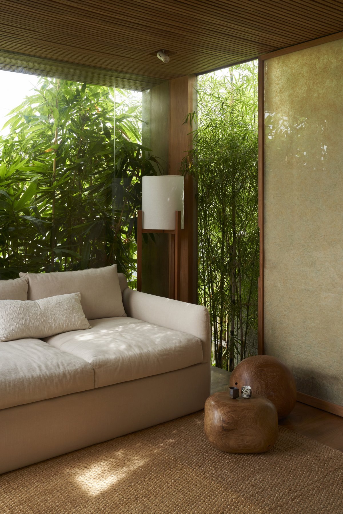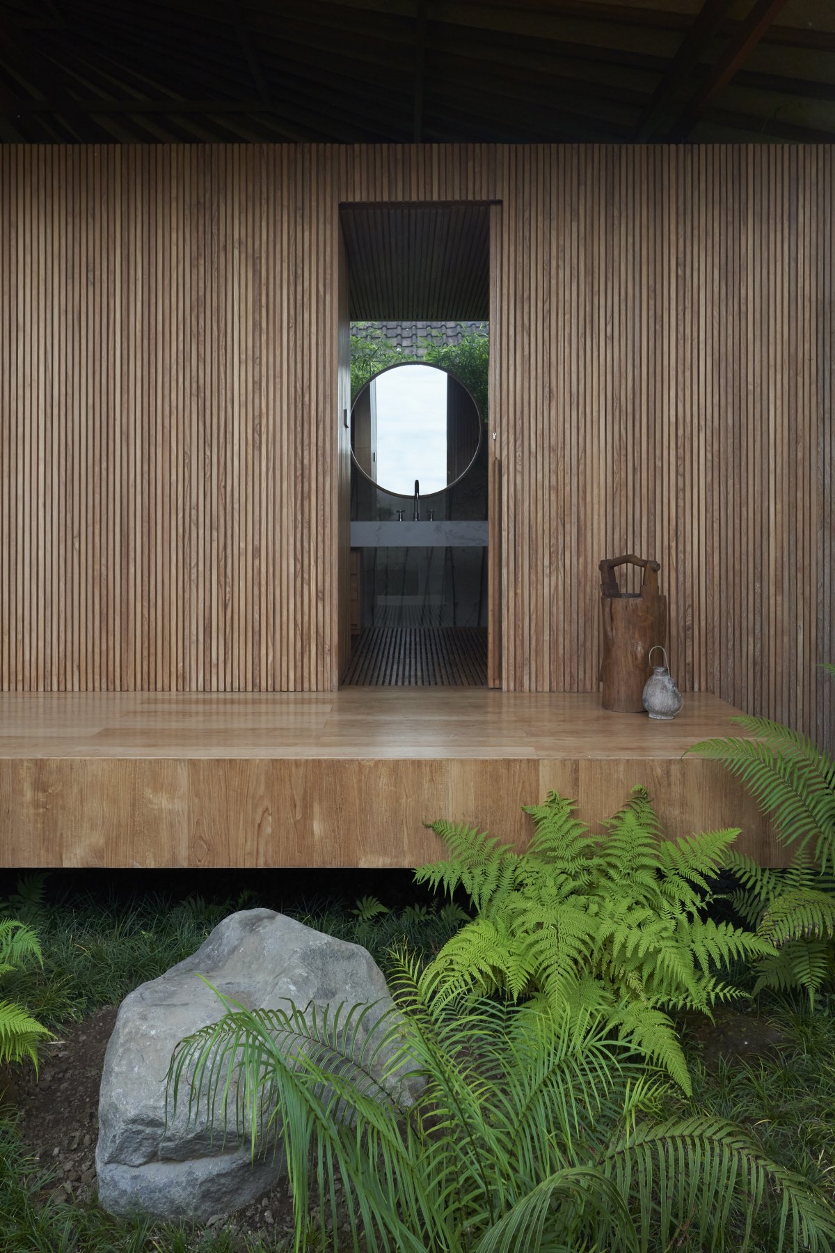 The intelligent use of space, despite its compact dimensions, ensures that the spaces do not feel confined. The Japanese inspiration in its design interconnects the natural sensations of the exterior with the serenity of the interior, generating a perception of intimacy, rather than compartmentalization. With a sustainable intent, the design team made the most of conventional and locally sourced materials, using traditional Indonesian carpentry and structures and building the project with timber from a declining tree found on the banks of the Bengawan Solo River on the island of Java.