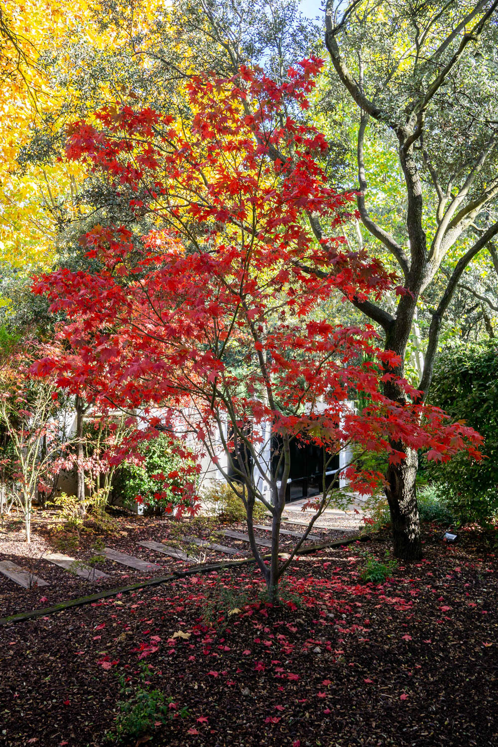 The choice of species such as Liquidambar styraciflua or certain types of maple responds to both aesthetic and functional criteria. Their elegant bearing and spectacular chromatic transformation during autumn generate a strong visual impact, marking the rhythm of the seasons and dialoguing with the architecture through color.