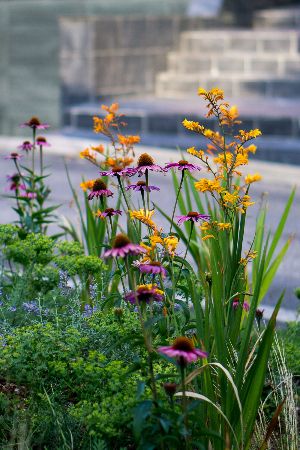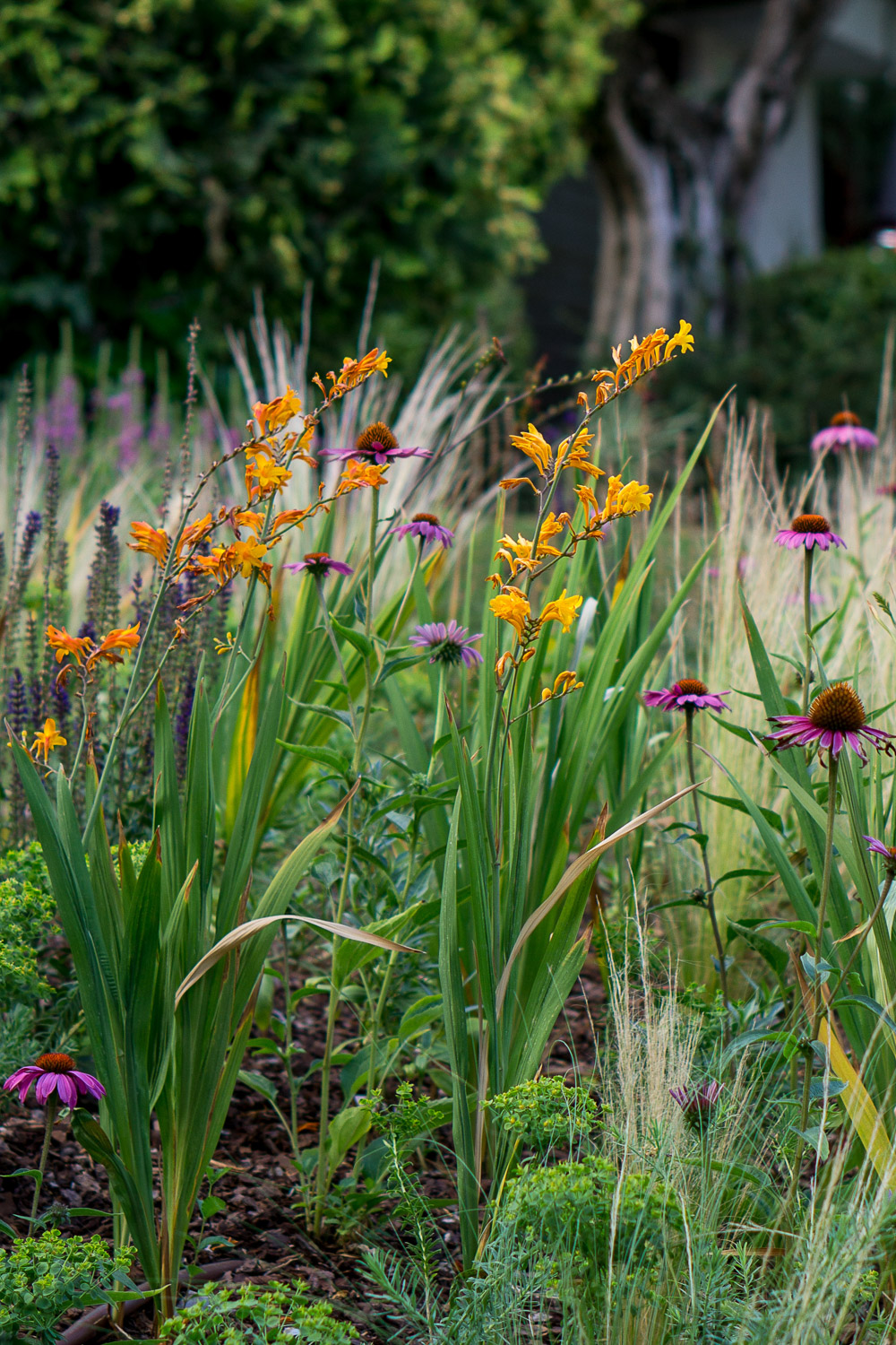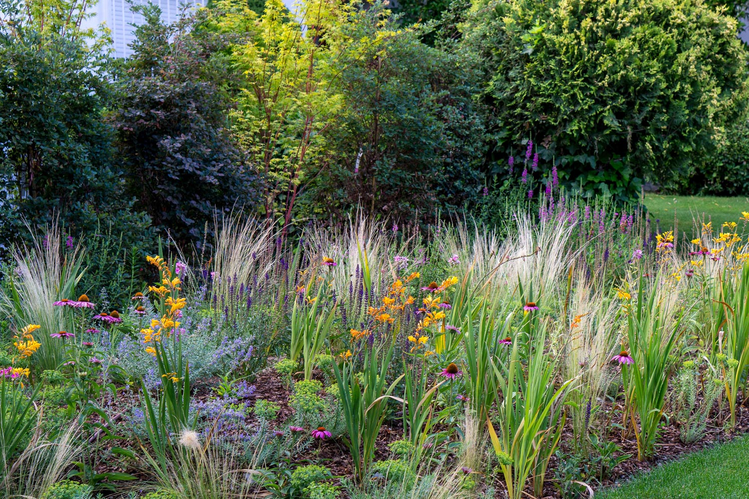 Natural stone paths guide the eye and footfall, while low hedges define the path without blocking the view. Perennials with staggered blooms offer seasonal dynamism, keeping the garden attractive in spring, summer and part of the fall.