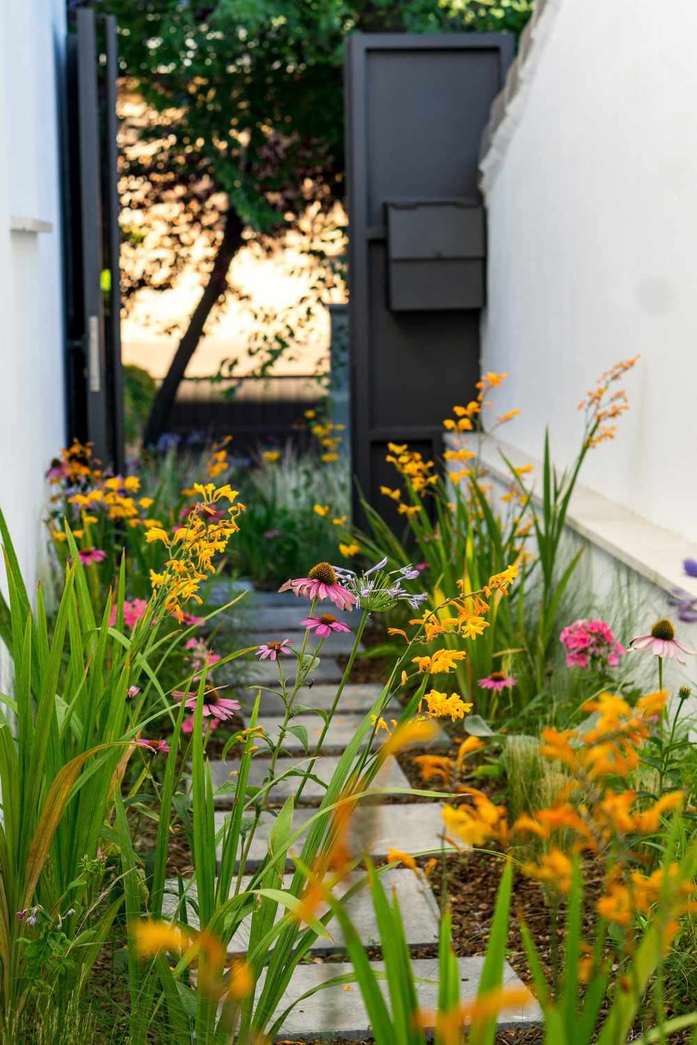 A well-designed garden entry can include aromatic species such as lavender or rosemary, which add fragrance and a relaxing Mediterranean touch.