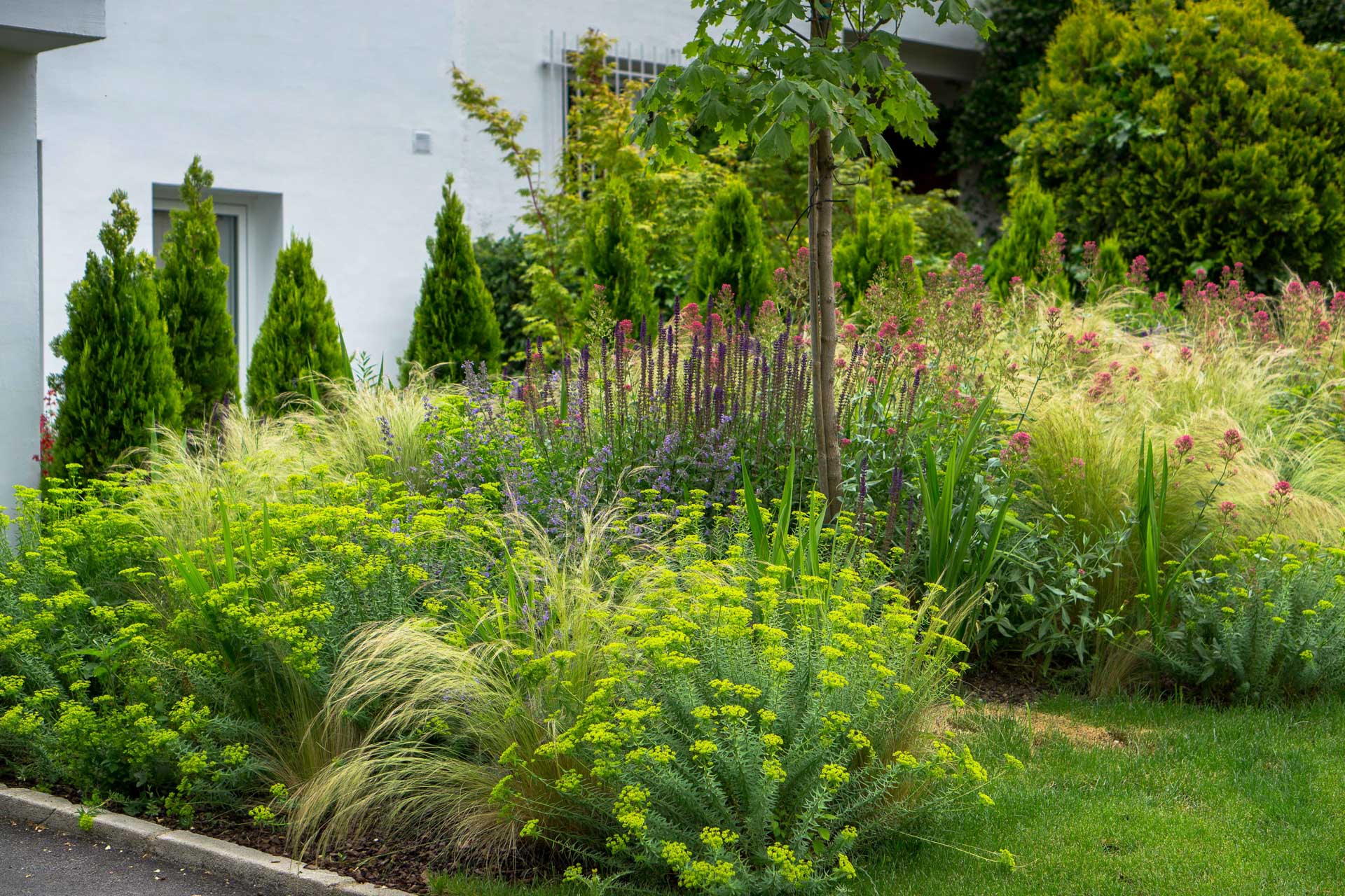 Our approach prioritizes a more sustainable, low-maintenance garden: we select climate-adapted plants, optimize irrigation and drainage, work the soil, and design dense plantings. We care for the relationship between architecture, outdoor space, and landscape, designing paths, seating areas, shade, and viewpoints so the garden is experienced as a natural extension of the home.