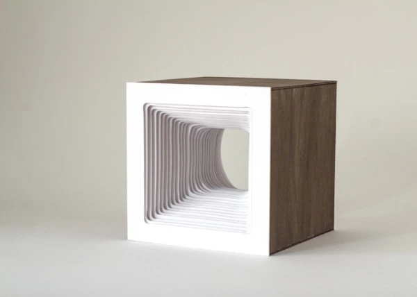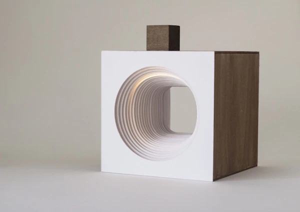 Esta original lámpara-escultura en madera, con una estructura cúbica externa de 20 centímetros de lado, esconde su auténtica personalidad en el interior. Cuando se encuentra apagada, su diseño a base de huecos superpuestos -cuadrados o circulares- que se van estrechando conforme avanzan hacia el fondo recuerda a un mapa topográfico, creando sombras, volúmenes y un efecto decorativo por sí misma. El contraste entre el blanco luminoso de esta zona y el veteado oscuro del exterior aumenta su encanto.