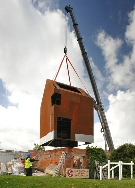La nueva estructura de Cor-Ten está fabricada a partir de láminas de 1200x2400mm con una sucesión escalonada de puntos de soldadura en los que los huecos de ventanas y puertas se cortan in-situ de acuerdo con los planos existentes. Los paneles de tabiques y cubierta son pre-fabricados fuera y se soldaron juntos en una parcela cerca de las ruinas; la estructura final se instaló con una pluma en un sólo día. El interior -muros y cubierta- están aislados, sellados con una capa de vapor de alto rendimiento y forrados con madera de picea contrachapada para crear una caja de madera dentro de la estructura de Cor-ten. Las escaleras, entreplanta y pasamanos también son de láminas de contrachapado.