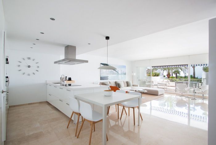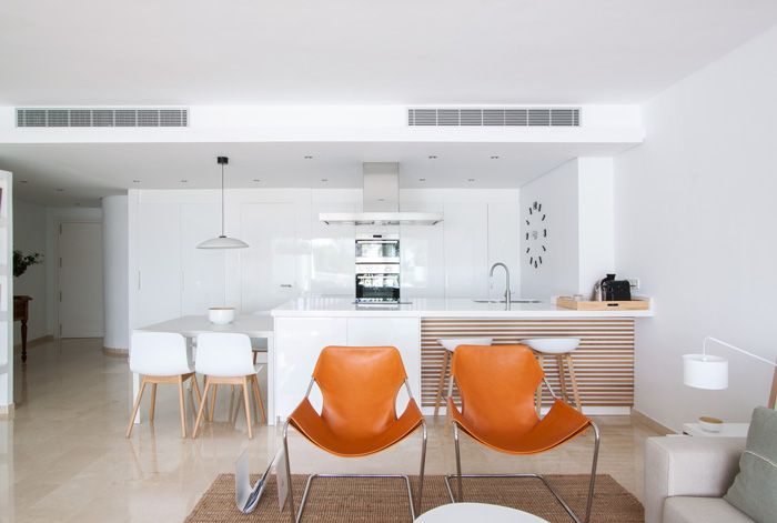 El color blanco y la iluminación natural hacen que una estancia parezca mayor de lo que realmente es. Si además unificamos este espacio con una cocina americana y decoramos el salón con colores neutros acompañando al blanco de paredes y techos, nuestra cocina americana puede quedar increíble. Podemos añadir notas de color en los textiles como cojines o plaid para el sofá, alfombras y mobiliario.