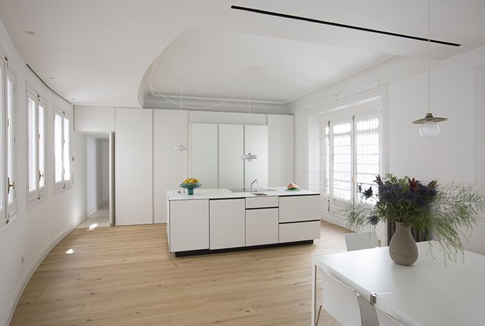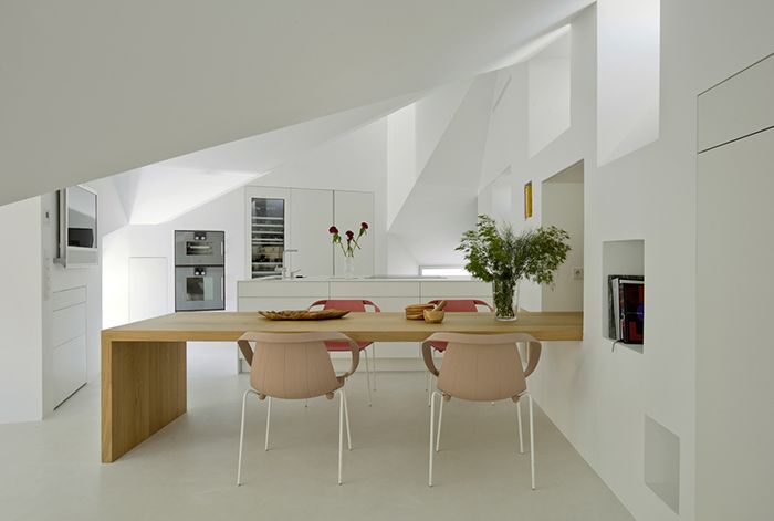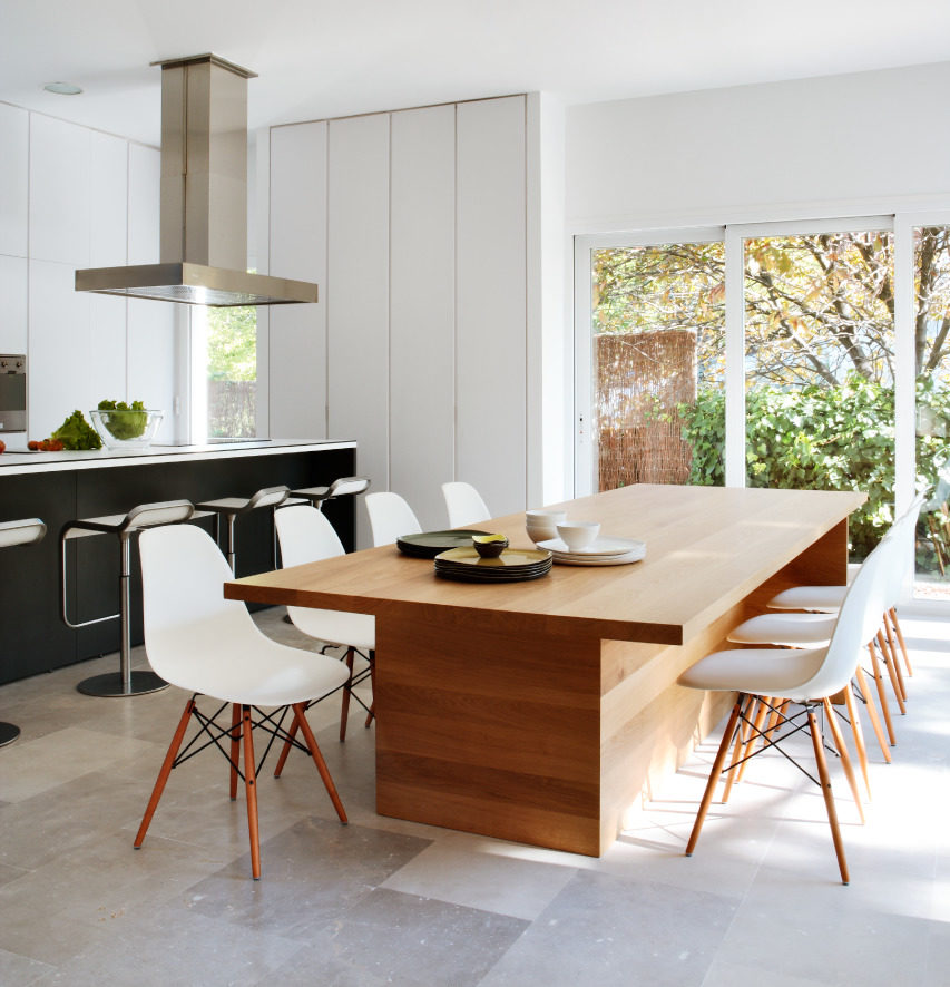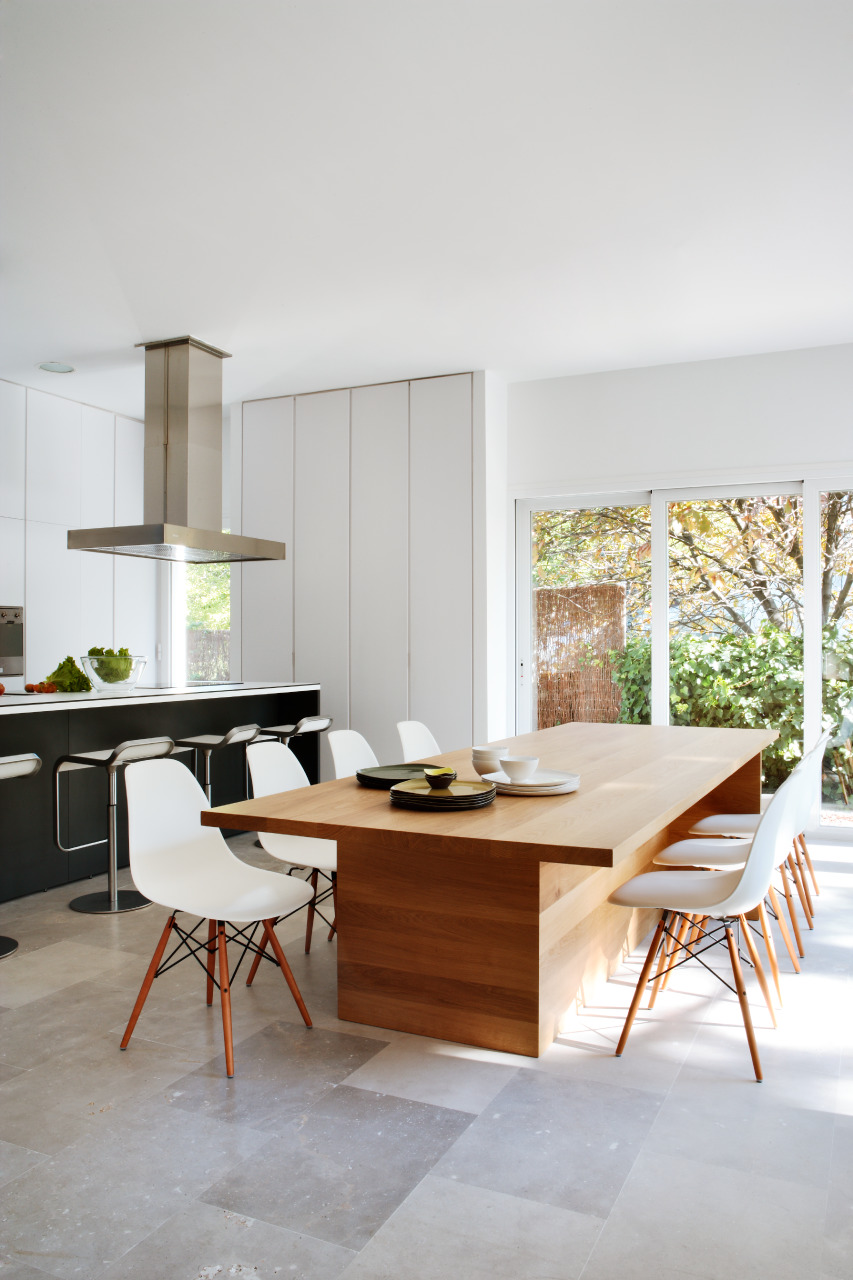 También podemos optar por integrar los electrodomésticos de mayor tamaño, dejando visibles parte de los electrodomésticos, con acabado en color cromo. Y cómo no, saquemos partido a los elementos arquitectónicos de nuestro hogar, como en este caso en que la mesa de cocina en madera maciza se funde con la fabulosa arquitectura de esta vivienda.