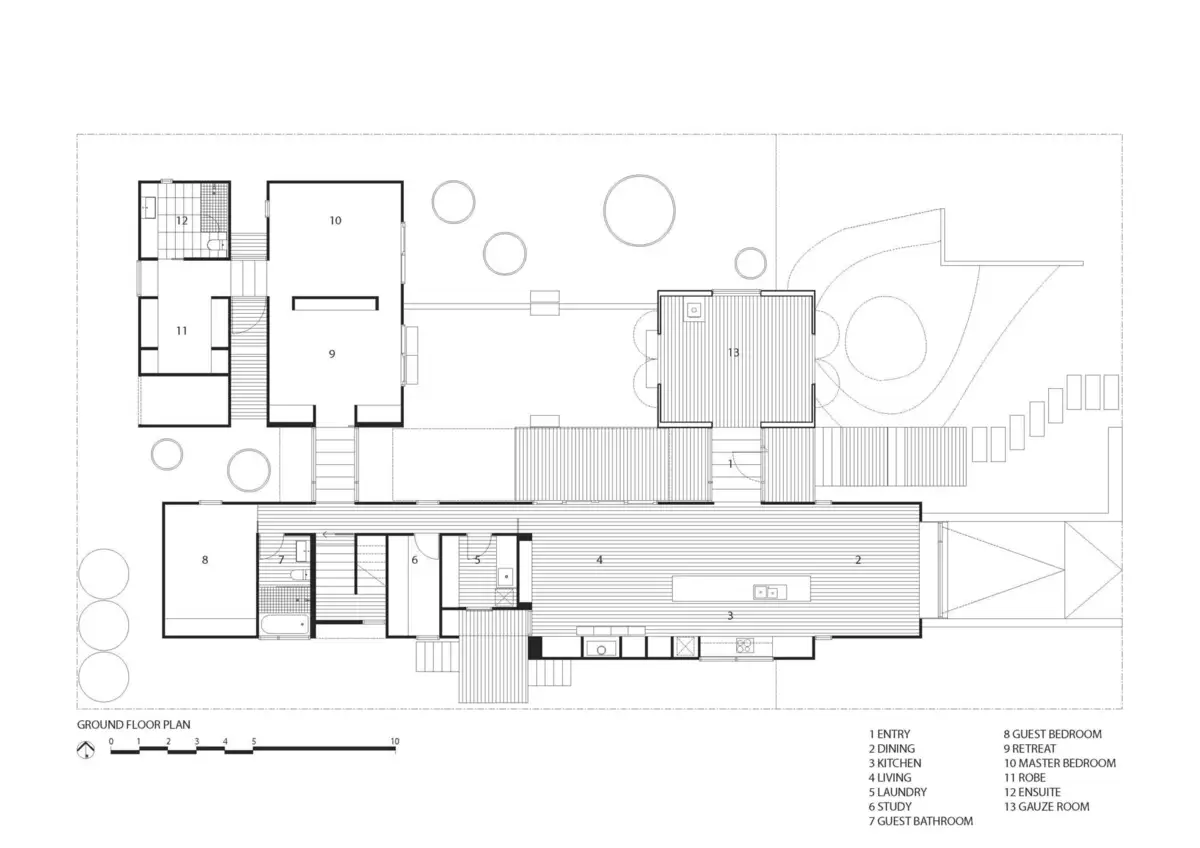 Los diferentes volúmenes se asientan sobre un muro perimetral de mampostería que divide un paisaje de grava y plantas y el patio de césped.