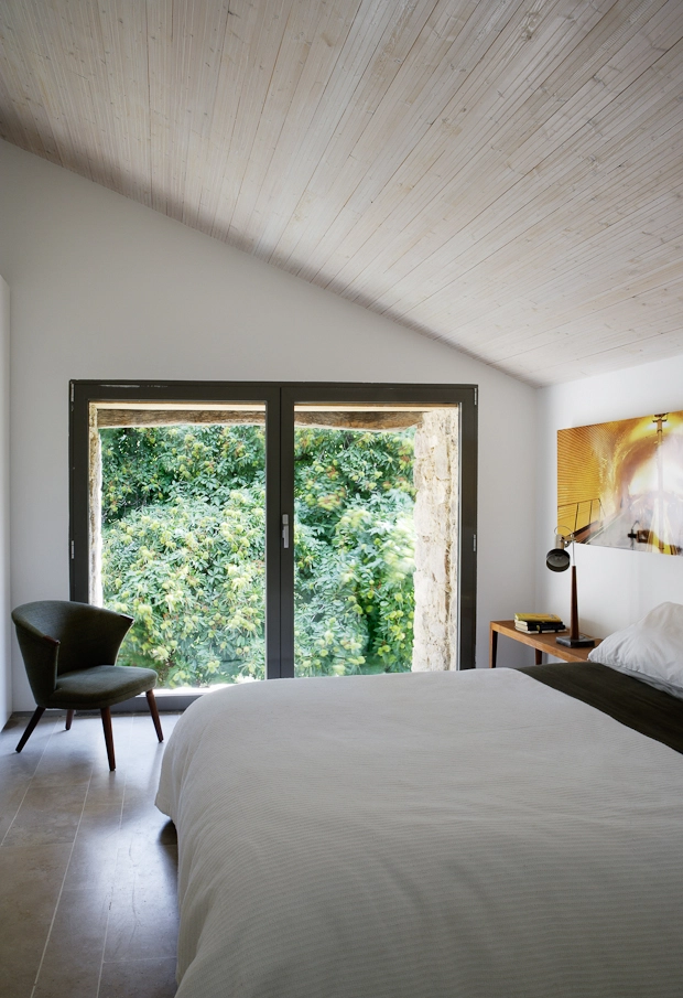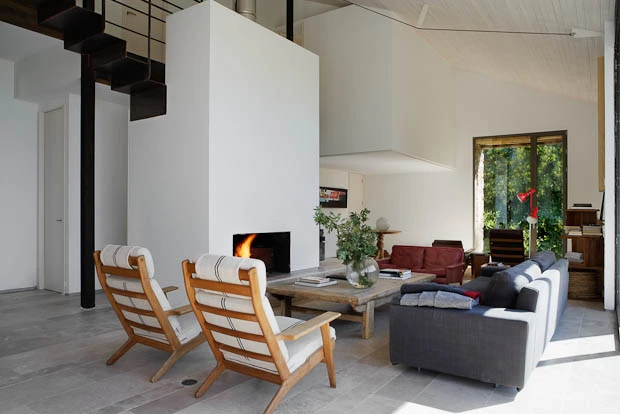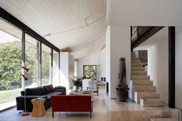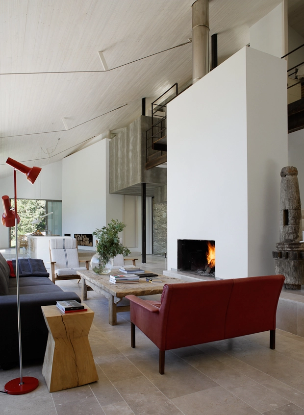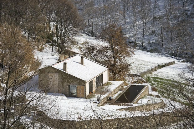 El espacio central se abre completamente norte-sur para potenciar las vistas al valle y la sensación de vivir en el exterior. Aunque de manera natural la vivienda es térmicamente estable, se solucionaron los problemas derivados de la falta de suministros de electricidad y agua corriente mediante los sistemas de sostenibilidad que ÁBATON aplica a todos sus proyectos: se diseñó un sistema de paneles solares con acumuladores que permite el suministro de energía en verano; se instalaron turbinas que aprovechan el cauce de dos arroyos que pasan por la finca y que nutren de corriente eléctrica a los acumuladores en invierno.