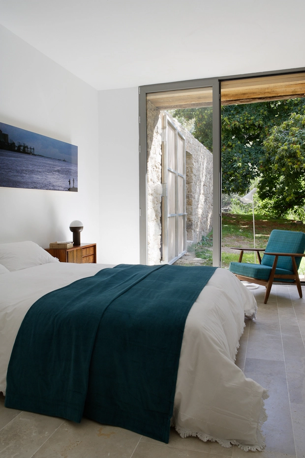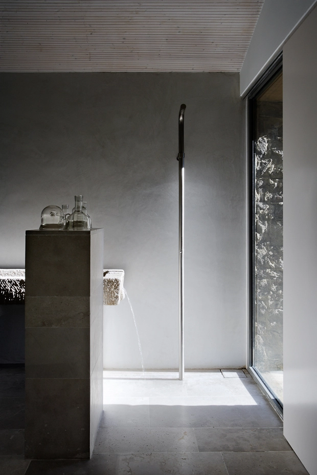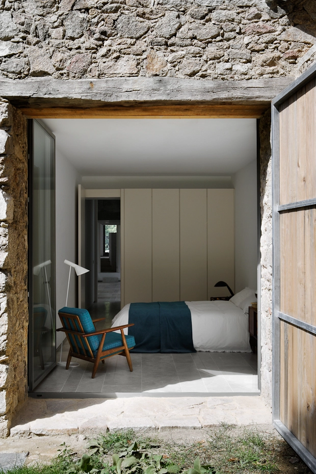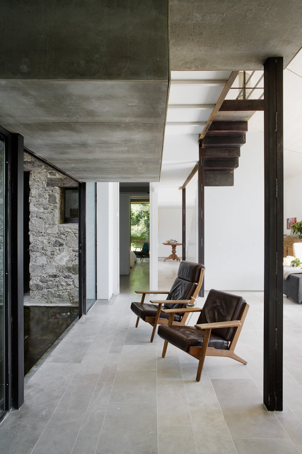 Se construye un gran espacio central para el salón y la cocina, al rededor del cual se ordenan las distintas piezas destinadas a habitaciones. Se trabajan materiales básicos: agua, hierro, cemento y la piedra existente; se aligera el interior sustituyendo los muros de carga por ligeros pilares metálicos.
