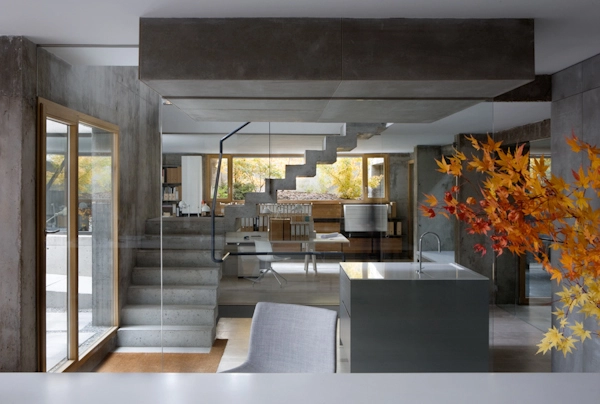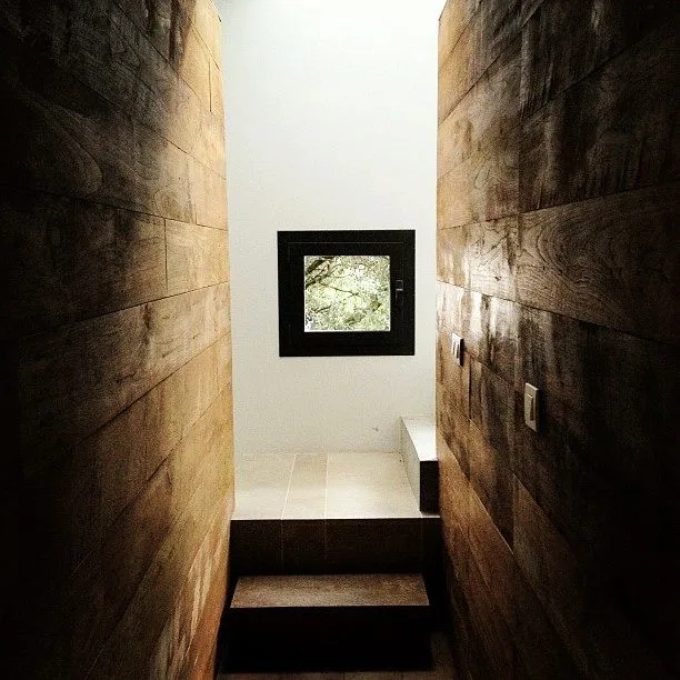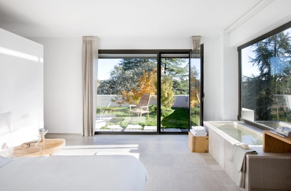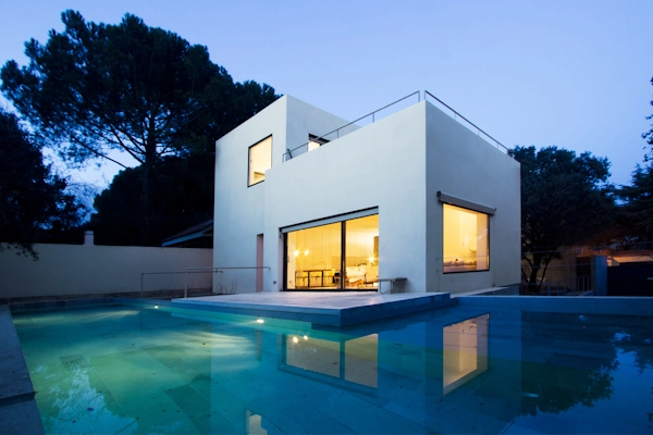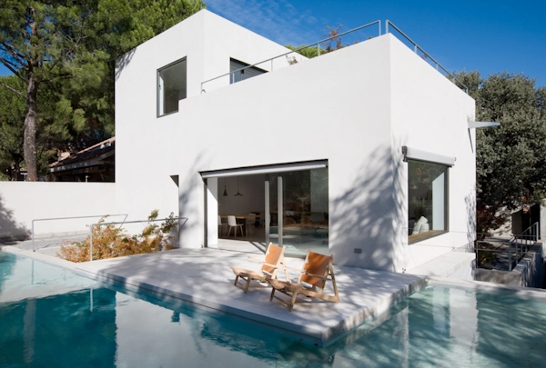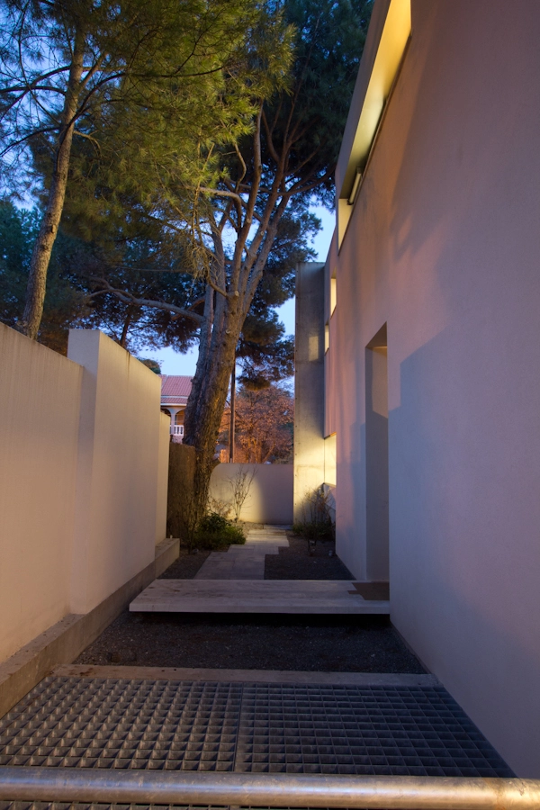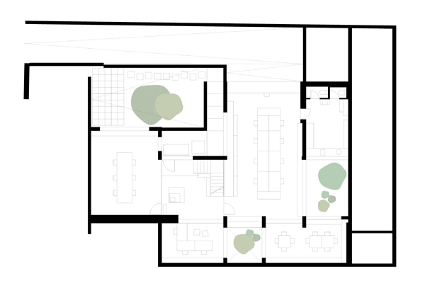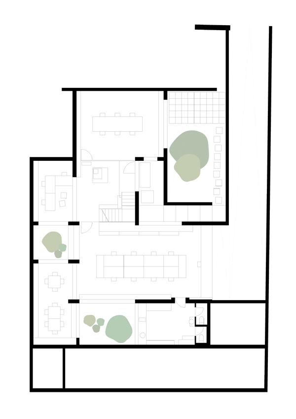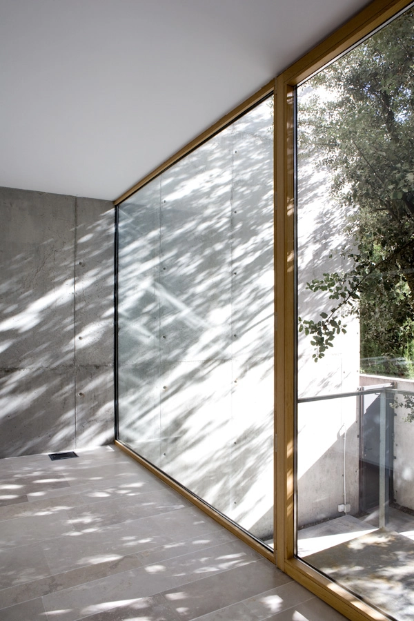 En el área que comprende el showroom (225m2) se exhiben los diferentes materiales y acabados que el estudio utiliza en sus proyectos, así como ideas de decoración y mobiliario que suministra BATAVIA (socio del estudio en los proyectos de interiorismo). Este mobiliario va cambiando en función de la época del año y de la novedad. En la parte central, se incrustó un cubo que flota sobre el sótano y funciona como corazón de la vivienda al servir de paso hacia las estancias superiores mediante una excavación interior. Cuenta con cocina con electrodomésticos de última generación, baño de invitados, salón y comedor con salida al jardín y piscina y 2 dormitorios con baño incorporado. La piscina, de grandes dimensiones, sirve para disipar el calor de la máquina de absorción.