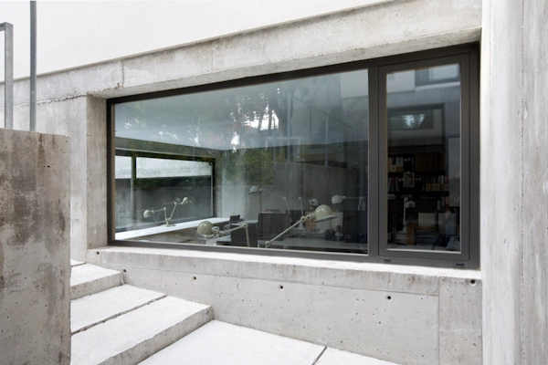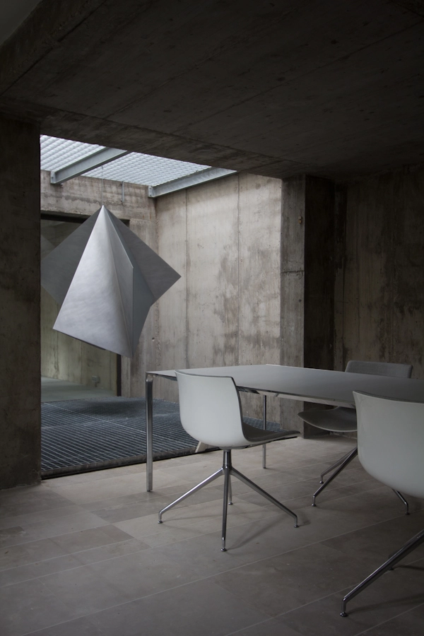 En el espacio dedicado a oficina se ubica la sede central del estudio donde trabajan -en un espacio compartido- arquitectos, aparejadores y las diferentes direcciones generales y administración. Además, cuenta con cocina para empleados, dos salas de reuniones y comedor. Los muros de hormigón se han recubierto de estanterías y armarios reforzando el aislante térmico del edificio.