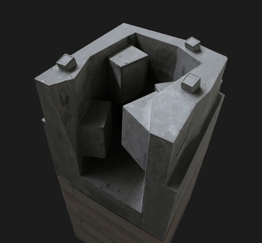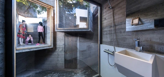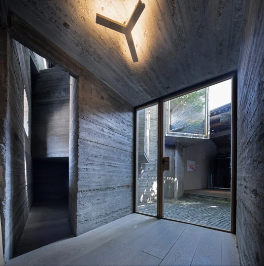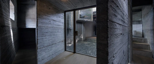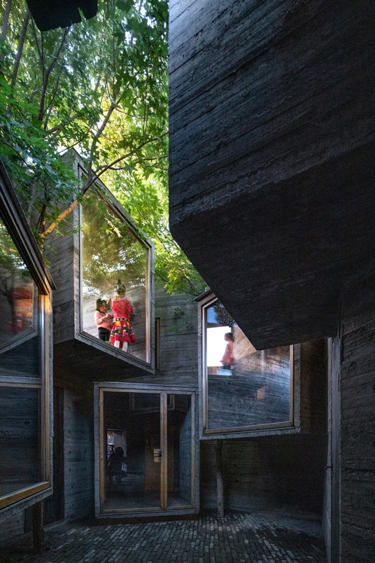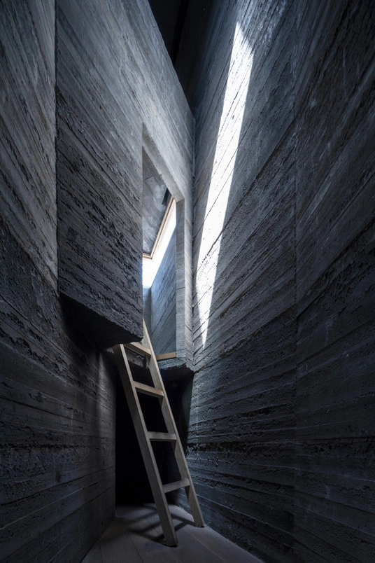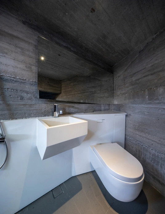 Para moldear el cuerpo principal se empleó hormigón mezclado con tinta china, una opción que da continuidad a la escala de grises de tejados y suelos. La masa compacta resultante se ve aligerada por la disposición en voladizo de las cinco habitaciones, con sus respectivos muros transparentes, y la inclusión de dos árboles.