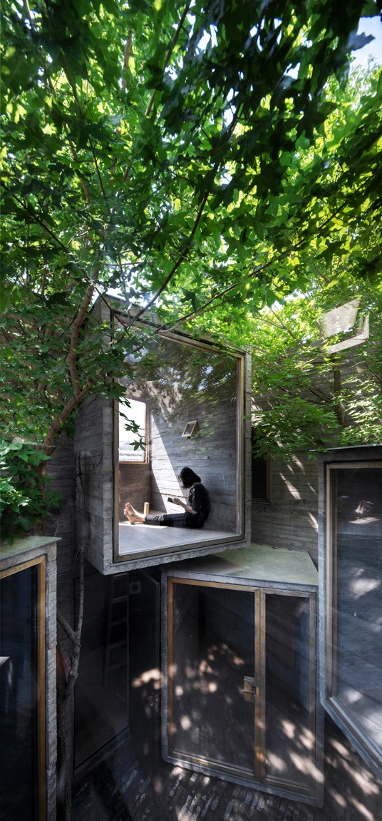 Esa entrada al Micro Hutong actúa como «sala de estar» común de los habitantes de la casa, zona de transición de las áreas privadas hacia la calle o incluso espacio semipúblico para compartir con los vecinos (rescatando así su espíritu comunitario original).