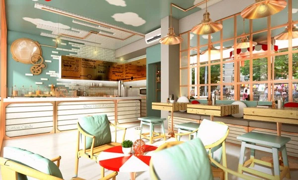 Este estudio de arquitectura y diseño tailandés, fundado en 2011, ha sabido sacar un extraordinario partido a un espacio de 50 m2 con un despliegue de colorido y formas envolventes que nos evocan la fábrica de chocolate de Willy Wonka. Lo primero que llama la atención es la fachada, que recibe al cliente con una gran cristalera y un conjunto de enormes engranajes que hacen volar la imaginación.