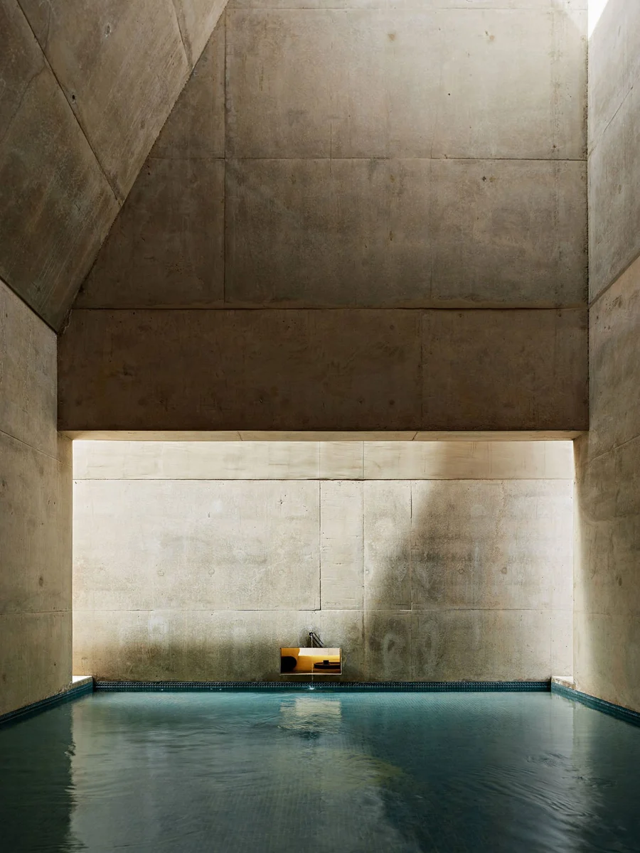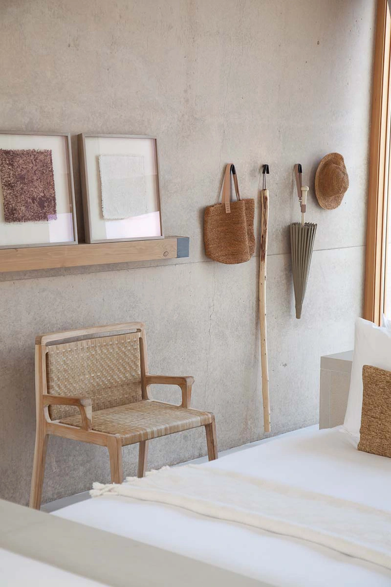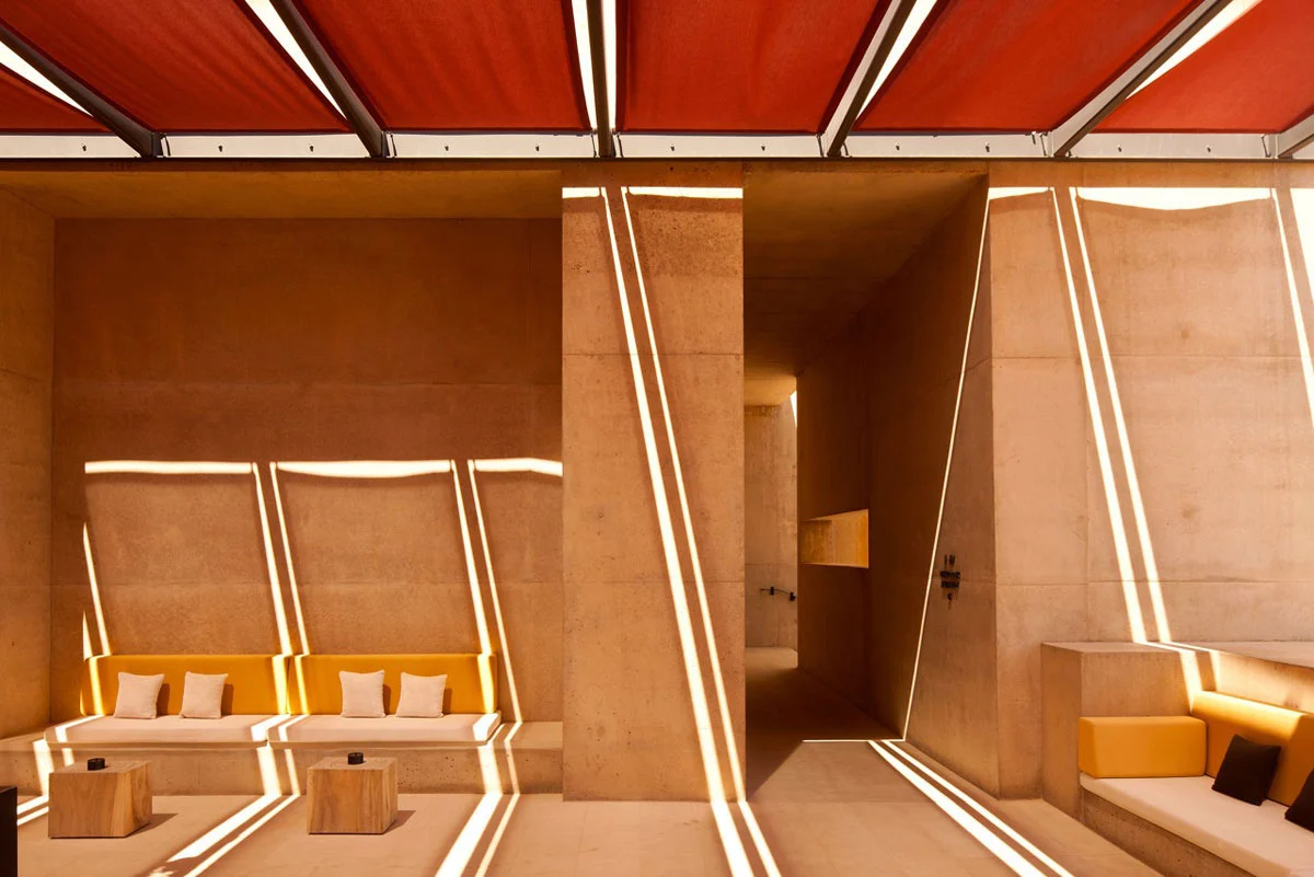 Los tonos ocres y la tierra roja del entorno desértico tienen su réplica en materiales como la piedra para los suelos, la madera de muebles y revestimientos o los múltiples elementos en hormigón visto (mezclado con áridos locales a fin de reproducir los colores neutros del valle y las montañas erosionadas). De este modo, la arquitectura se incorpora a la naturaleza como un complemento, colaborando en su exaltación en lugar de destacar sobre ella.
