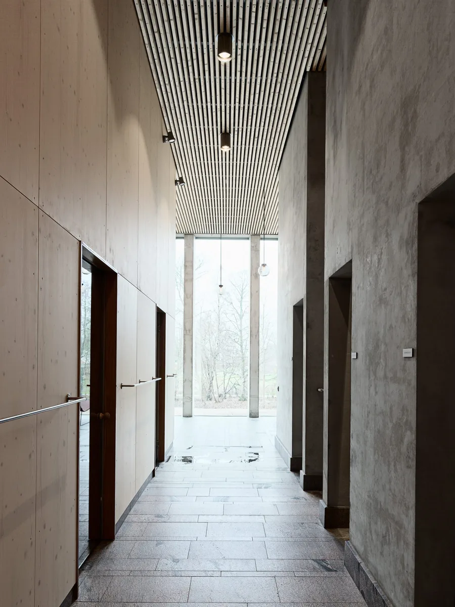 El equipo diseñó la construcción pensando en las impresiones sensoriales del usuario, sobre todo la luz, la acústica y el tacto. Crearon así unos interiores de líneas sencillas que ponen en valor tanto las panorámicas como la riqueza visual de los materiales. El hormigón visto, la piedra natural, el vidrio y los listones de madera forman un conjunto suave, discreto, muy en la línea de la estética nórdica.