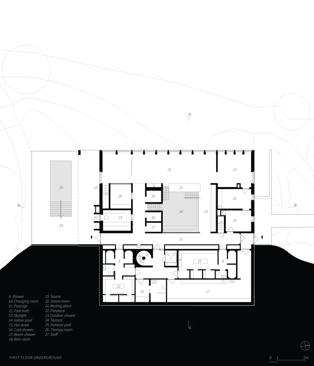 Andrum dispone de una serie de estancias interconectadas para aprovechar los beneficios del agua –baño, sauna, cascada y sala de vapor, entre otras–, así como salas para tratamientos y espacios de descanso.