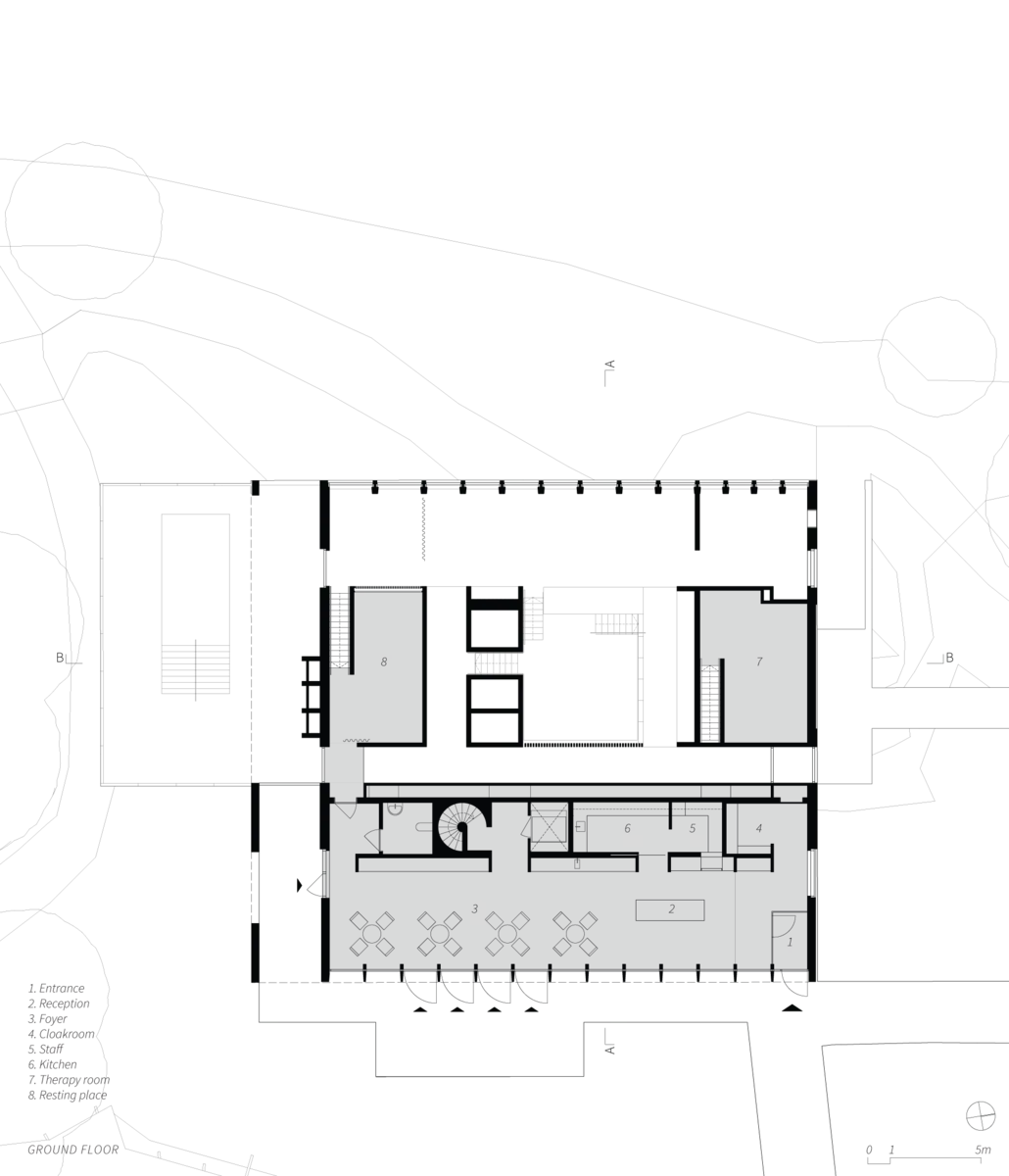 En el exterior, la base sólida de hormigón sobre la que se asienta el edificio matiza su contundencia gracias a la sucesión de acristalamientos a doble altura. Este empleo del hormigón a modo de columnata aligera toda la estructura y hace posible una conexión visual con la capilla y el edificio principal. Por su parte, la calidez de la madera pone su nota de color en los costados y la fachada interior.