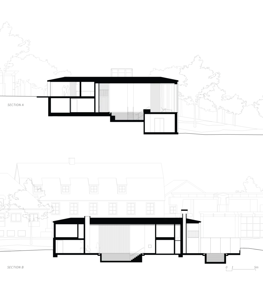 En cuanto a la distribución, una galería totalmente acristalada da acceso al área previa, mientras que la zona de spa queda en un plano inferior, excavado en parte. De esta manera se consiguen unos techos singularmente altos en todo este nivel, una amplitud que permite disfrutar al máximo del sol y de las vistas a la naturaleza circundante.