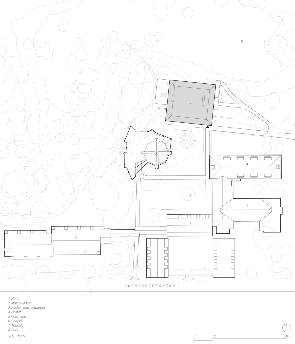 El edificio, proyectado por la firma Johan Sundberg Arkitektur en colaboración con Blasberg Andreasson, ocupa el extremo occidental del jardín interior. Andrum (espacio para respirar, en sueco) se asienta en la pendiente de acceso al parque y queda subordinado a las estructuras ya existentes.