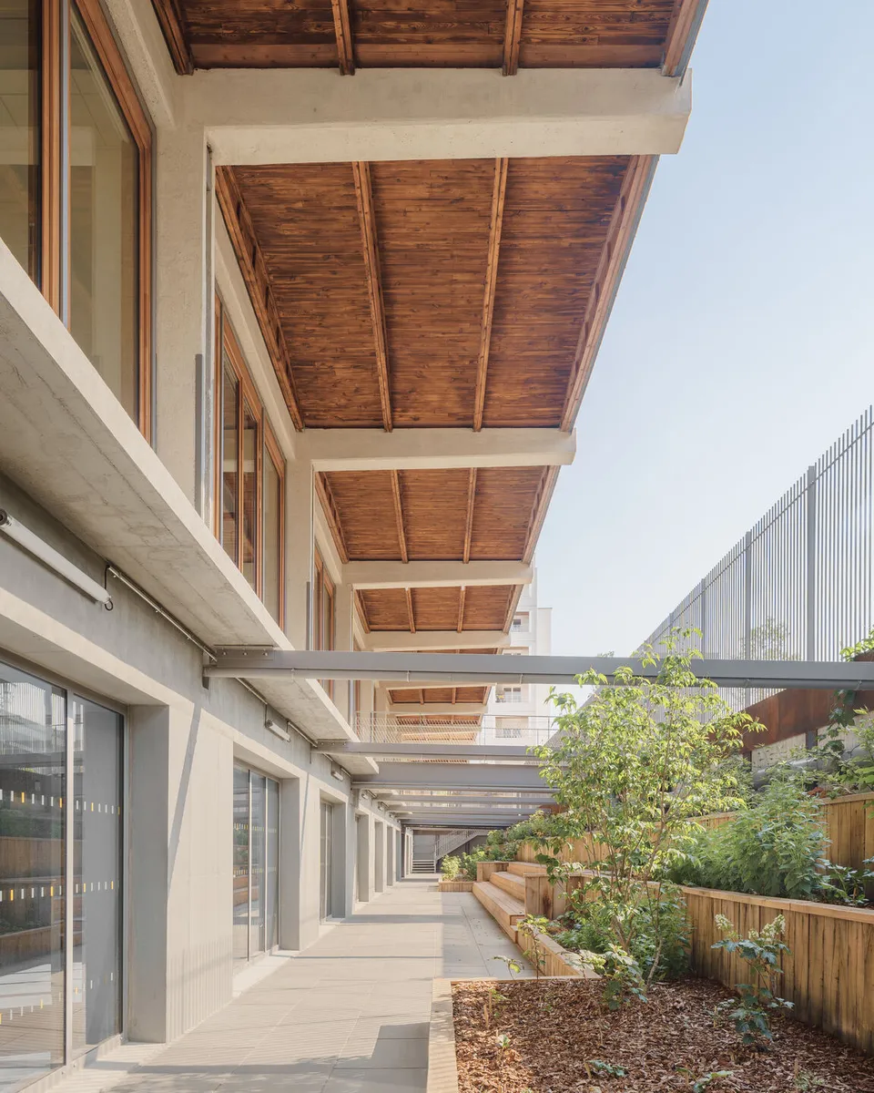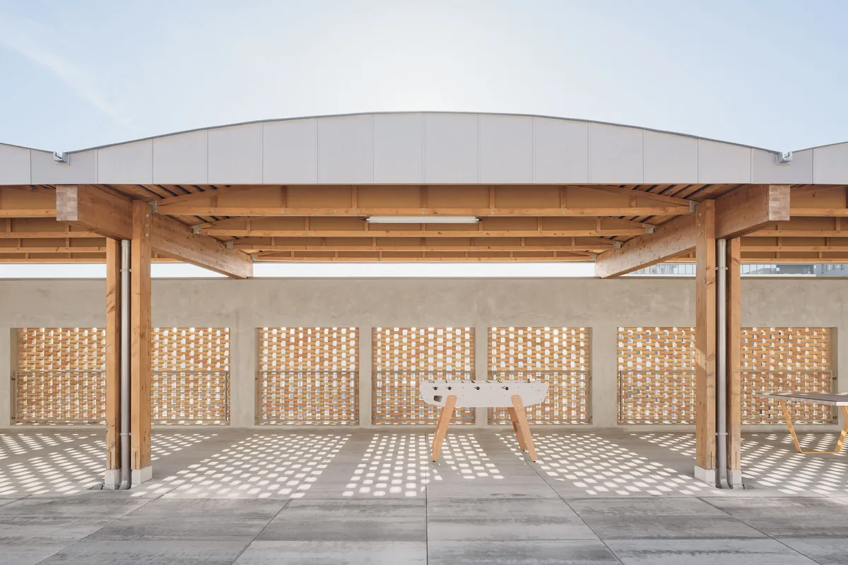 Uno de los aspectos más destacados del proyecto es la introducción de luz natural. La estructura original, aunque sólida, presentaba un reto en términos de iluminación. Vurpas Architectes abordó esto mediante la adición de grandes ventanas y tragaluces, que bañan los interiores en luz natural, creando un ambiente acogedor y estimulante para los estudiantes. Estas intervenciones no solo mejoran la calidad del espacio interior, sino que también establecen una conexión visual con el entorno urbano.