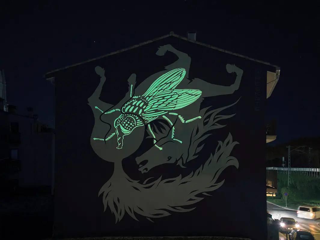 Así, en su mural «Asombrar», la silueta de un conejo desvela de noche la posición que tendrían que adoptar nuestras manos si quisiéramos crearlo mediante sombras chinescas. Simple, curioso e impactante.