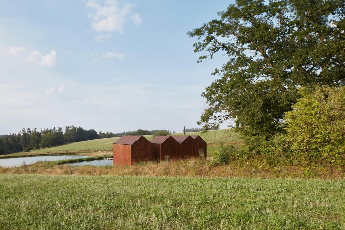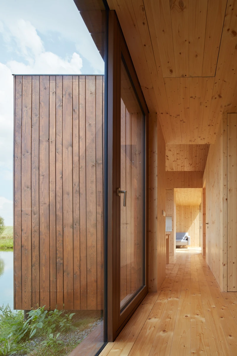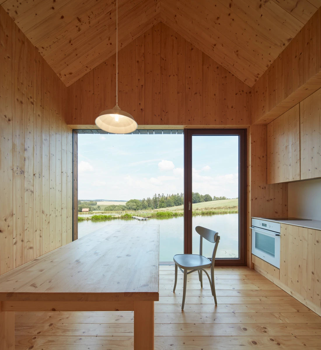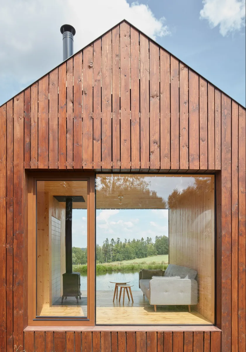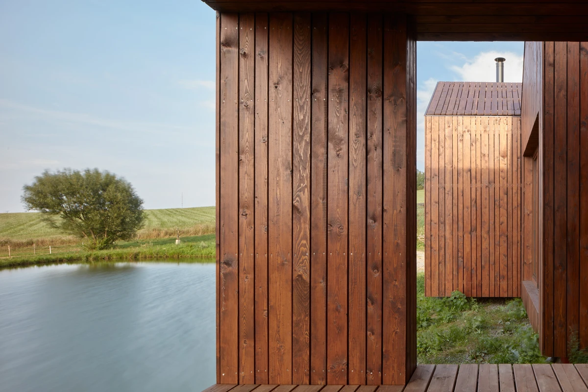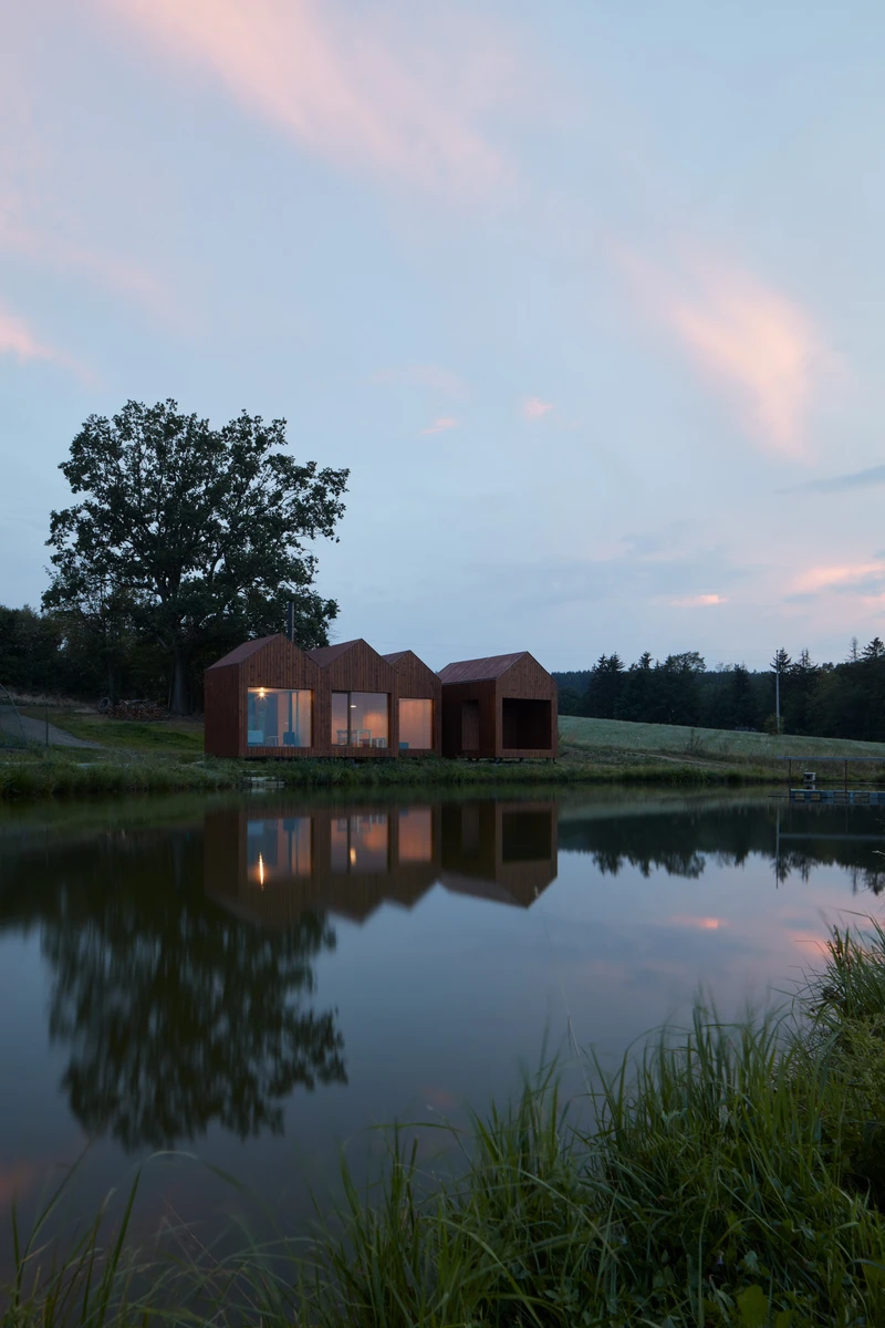 Hoy presentamos una casa de campo en madera inspirada en las cabañas de pescadores. Construida junto a un estanque en la región checa de Vysočina, a una hora en coche de Brno, está rodeada de naturaleza. De hecho, se trata de un enclave de humedales protegido, por lo que la legislación para nuevas construcciones en esta zona es bastante estricta: el área máxima edificable es de tan solo 50 m2, mientras que la altura no debe superar los 5 metros.