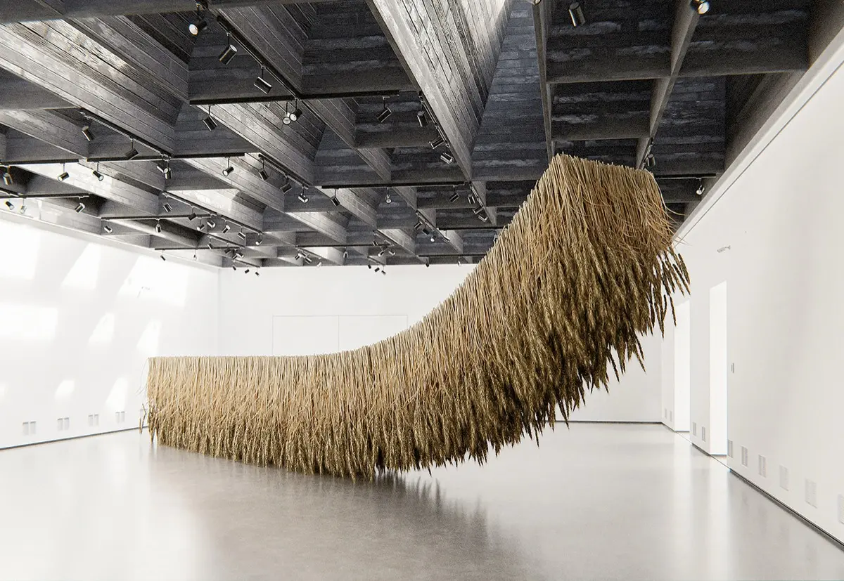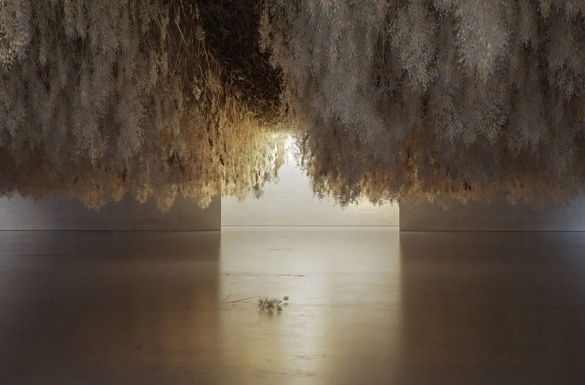 En esta obra de arte inmersivo, se yuxtapone el material efímero y seco de lo vegetal, con los espectadores que se encuentran debajo, generando un espacio de límite, de borde entre ambos, relajante e introspectivo, que se llena de cualidades espaciales y sensoriales.