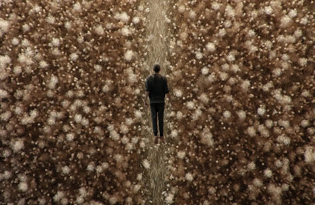 Caminar por los diferentes espacios de la instalación significa abordar un recorrido sensorial cambiante. A veces se percibe cada hierba, fresca y perecedera, efímera. A veces, al mirar hacia arriba, de pie, parece que el visitante camina del revés por un campo seco y dorado. A veces, al recostarse, esponjosas nubes parecen surcar un cielo plácido y azul…