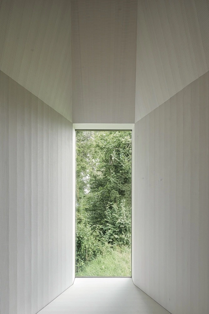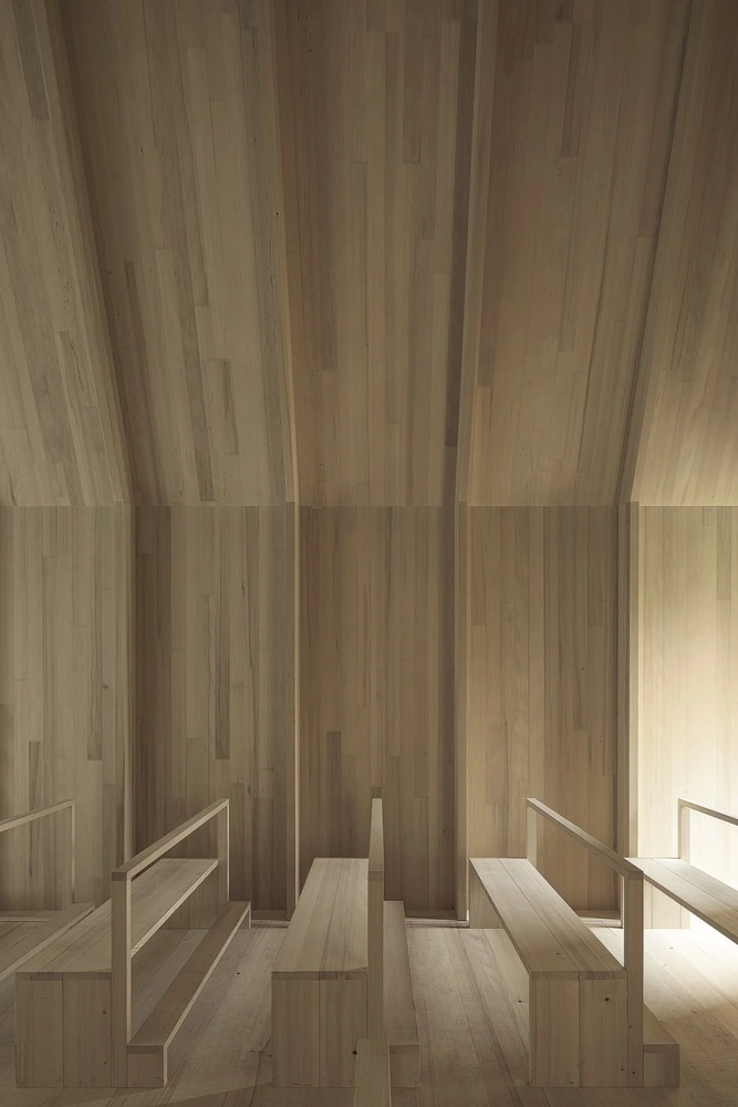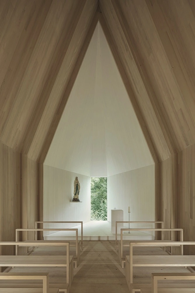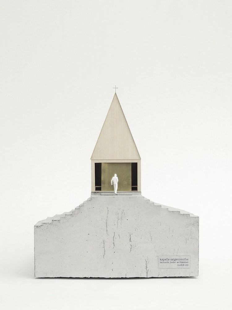 Siguiendo la pauta tradicional, la Capilla Salgenreute se levantó con piedra y madera. Su forma básica responde al original de doscientos años atrás, pero con elementos rabiosamente contemporáneos. Así, el interior se resuelve mediante un plegado del espacio realizado en madera, un material que envuelve suelo, paredes y techo a fin de crear un ambiente cálido y homogéneo.