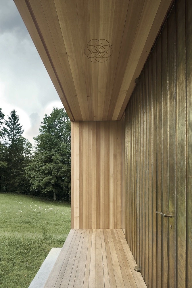 Un acceso retranqueado a modo de antesala invita a traspasar la rica puerta metálica de Salgenreute y ofrece la primera visión del sobrio interior gracias a dos tramos acristalados. Quizá sea una metáfora del viaje reflexivo de cada feligrés hacia lo esencial.