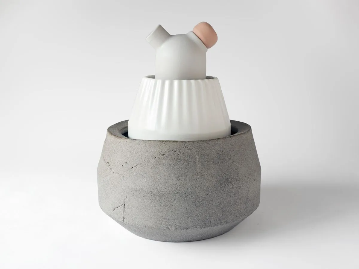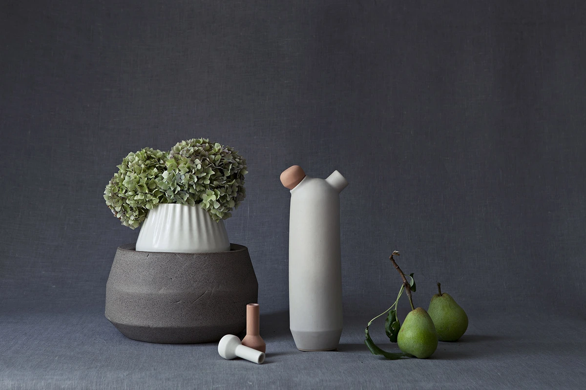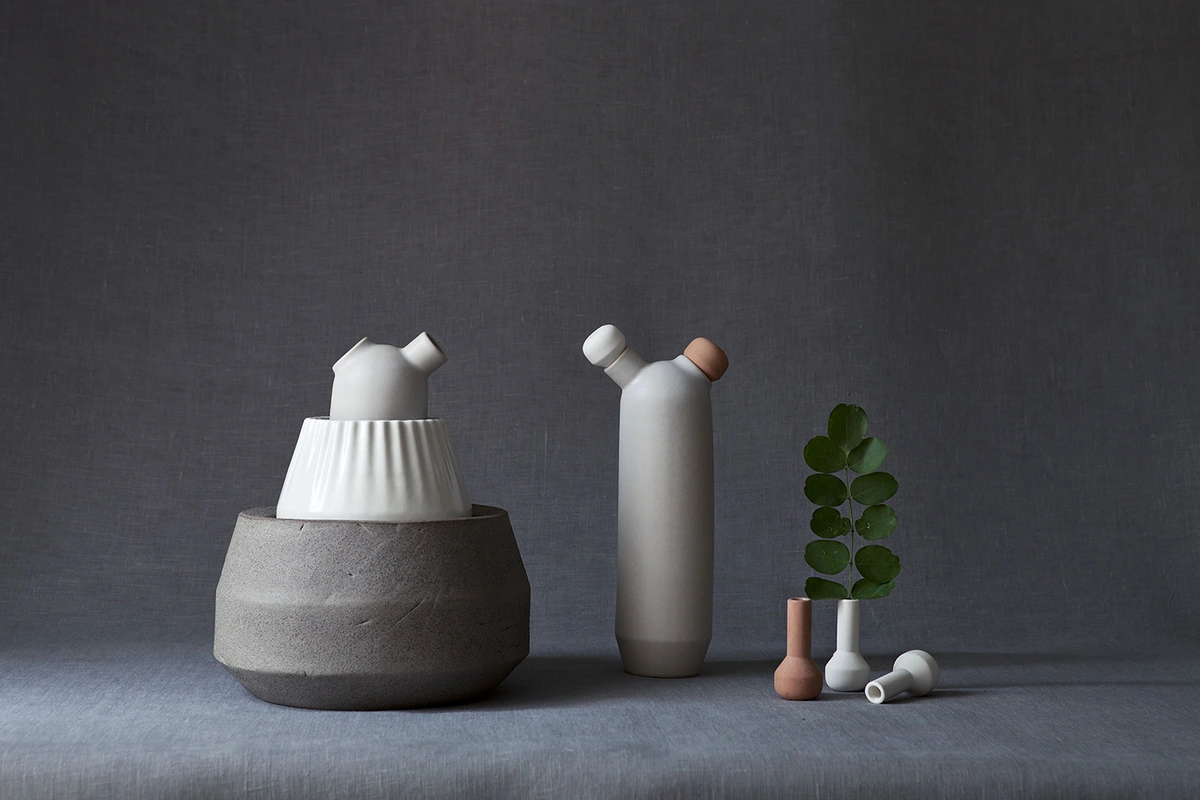 La pieza más grande de la colección es «Capsula», un bol de gres que simboliza el germen o la vaina protectora de la que brotan el resto de formas. De esa especie de abrazo en la base surge «Petalis», un vaso de porcelana que se va cerrando progresivamente hacia la parte superior para acoger a su vez a «Truncus», una jarra de cerámica ramificada con dos bocas asimétricas a modo de ramas incipientes.