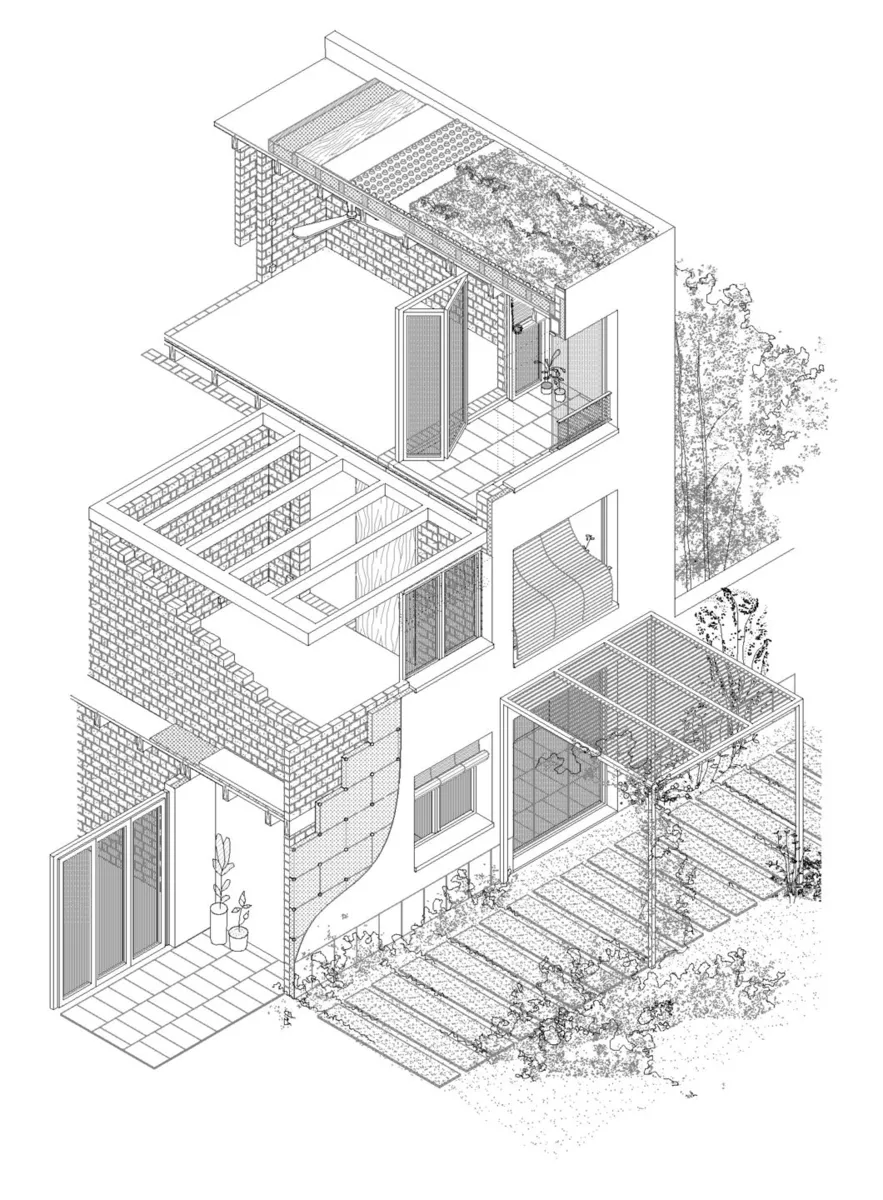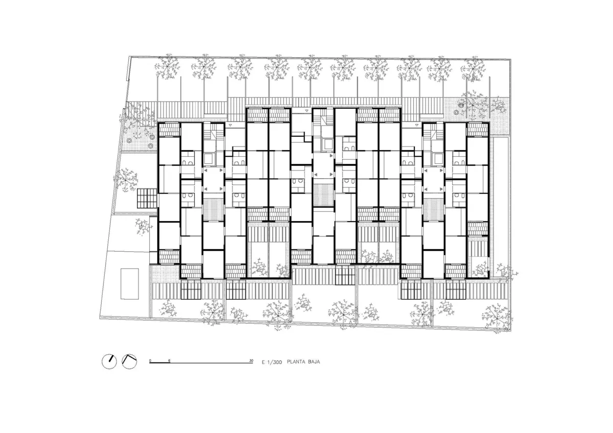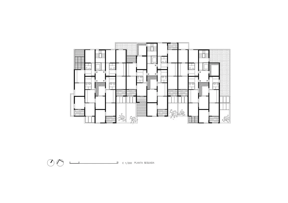 El sistema implementado se compone de muros de carga ensamblados con bloques de tierra comprimida de 20 cetímetros de espesor. Su distribución lineal permite secuenciar los espacios y combinarlos para crear viviendas de uno, dos y tres dormitorios.