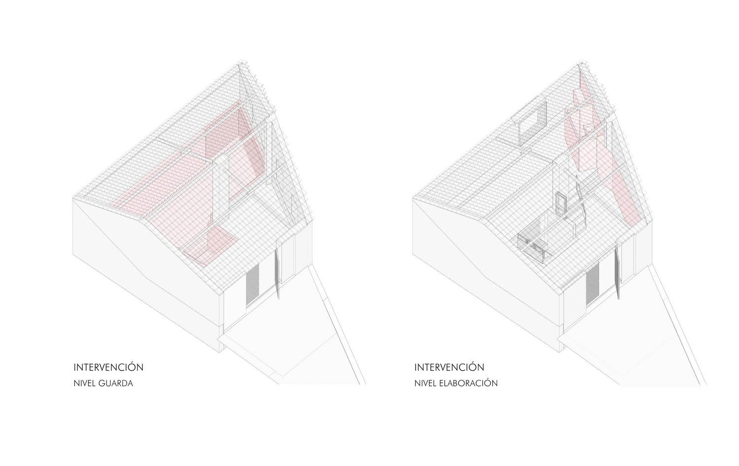 En planta baja converge el programa de recepción del fruto, laboratorios, y espacios de proceso. En la nave occidental, el antiguo tanque de hormigón del sótano ha sido reconvertido en cámara de crianza, aprovechando su inercia térmica para la conservación de barricas. En la planta primera se ubica la zona de recepción de uva y servicios (laboratorio, aseos), perforando el muro original para abrir un nuevo acceso controlado.