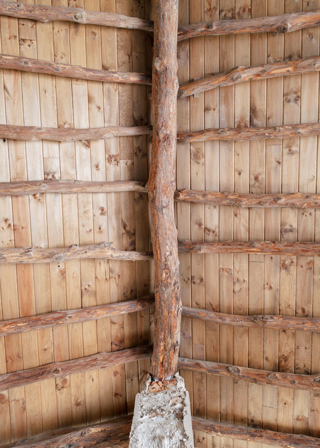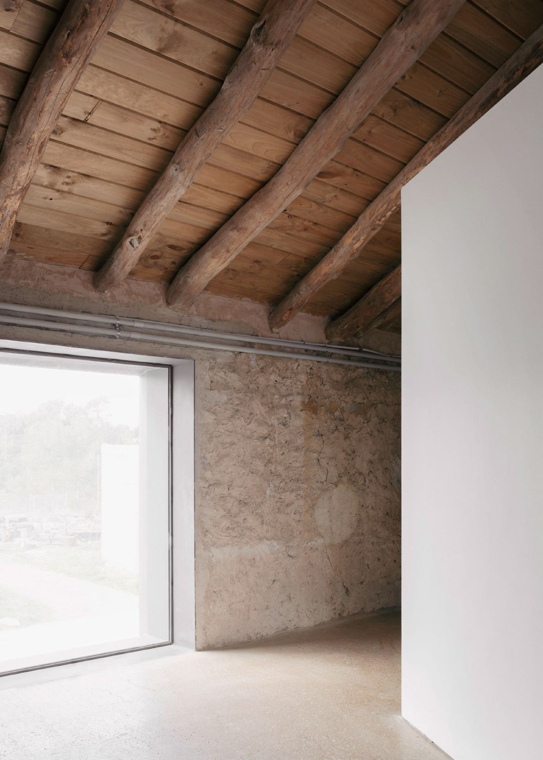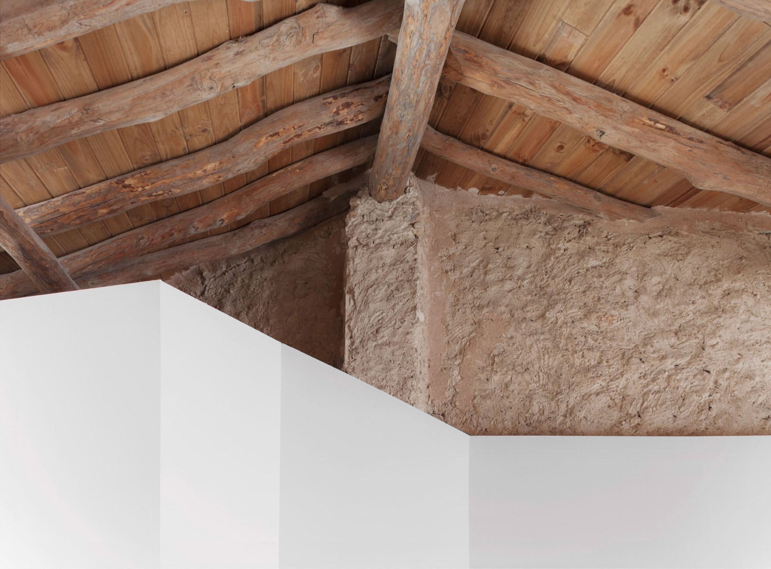 Uno de los gestos más respetuosos es conservar la cubierta ondulada original, añadiendo sobre ella un sistema de tratamiento de aguas. En las zonas intervenidas se incorporan listones de madera tipo tongue-and-groove, sustituyendo cañizos, y recuperando las tejas originales tras limpieza. En la fachada norte permanecen visibles grietas y huecos que hablan del pasado.