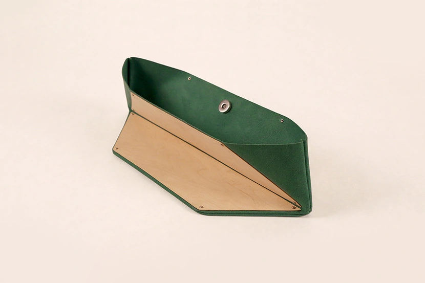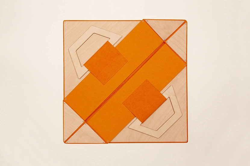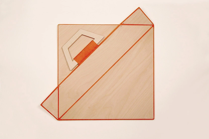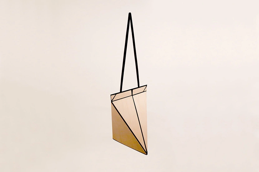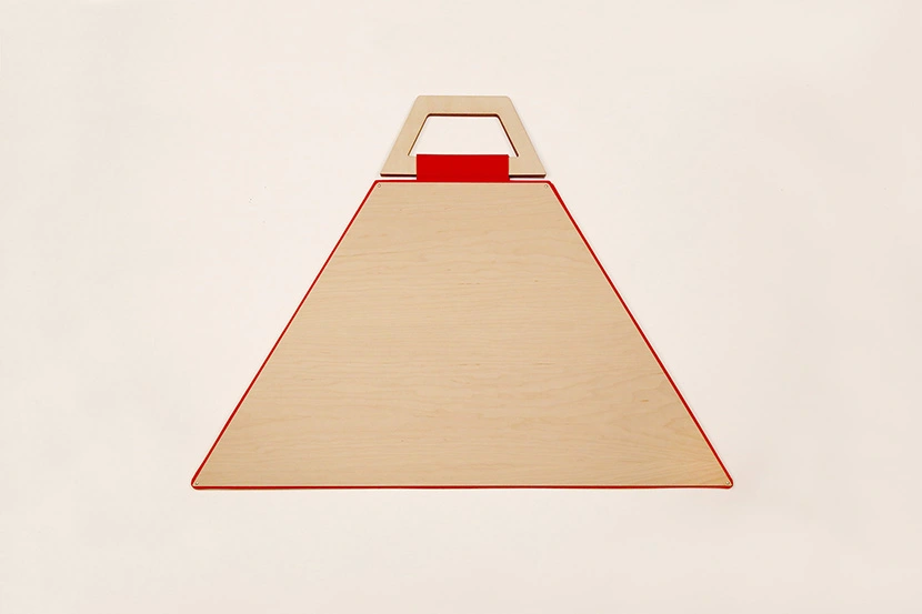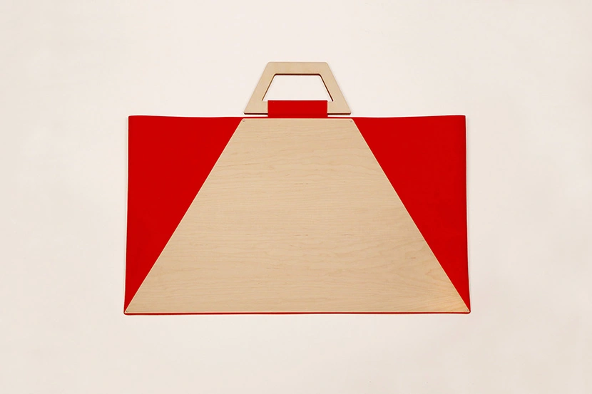 Los bolsos Facet están disponibles en telas de cinco vivos colores: rojo, naranja, azul, verde y negro, que combinan muy bien con el arce. Las tonalidades intensas destacan las formas angulosas y puntiagudas de la madera, que traen a la memoria las piezas poligonales del tangram a la hora de formar siluetas en el aire. De hecho, el nombre de esta serie es una clara alusión a cada una de las caras de un poliedro.