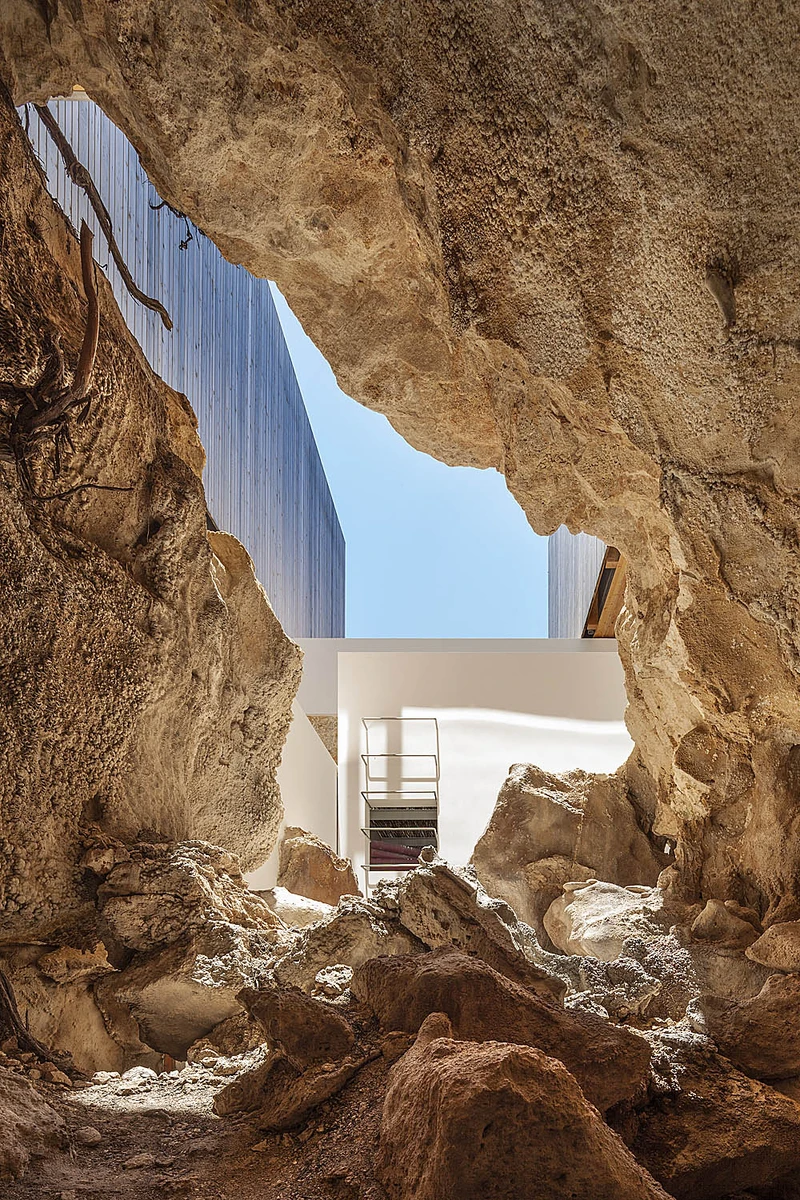El diseño tuvo además un colaborador artístico inesperado, ya que al realizar los trabajos de excavación se encontró una cueva natural en el patio de acceso principal. La integración posterior en el conjunto aporta un carácter único a un trazado ya de por sí peculiar.