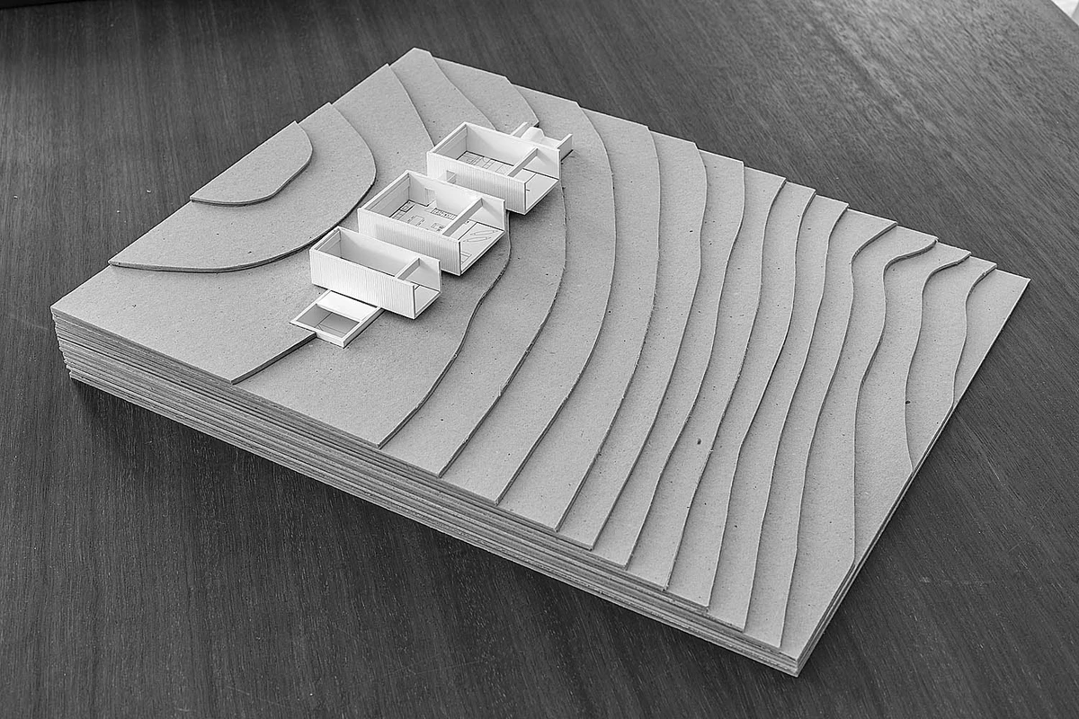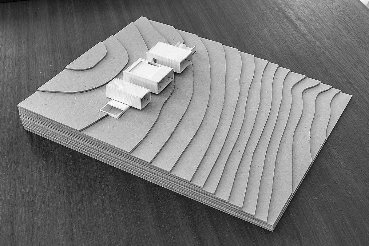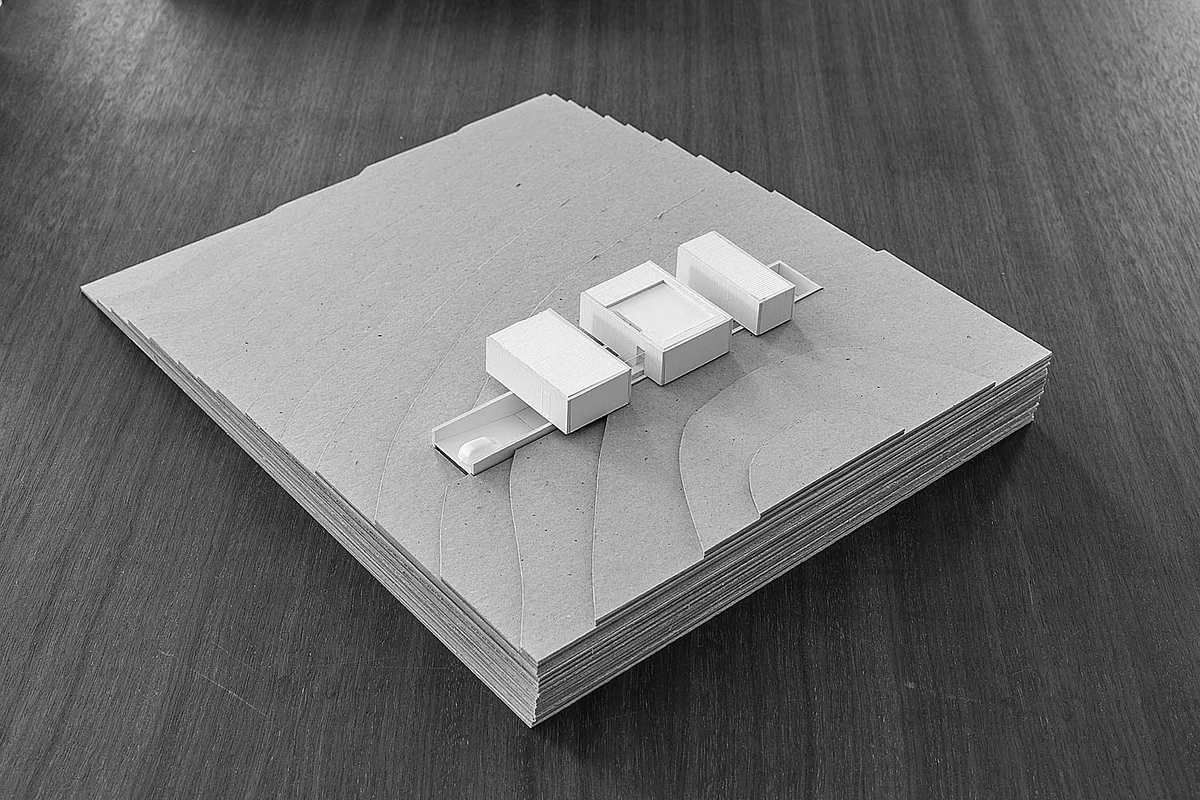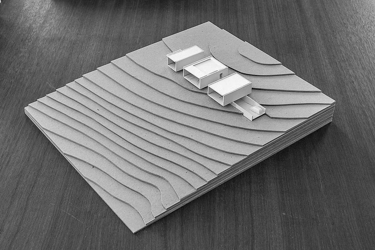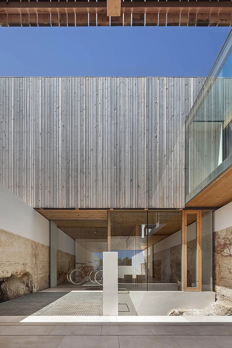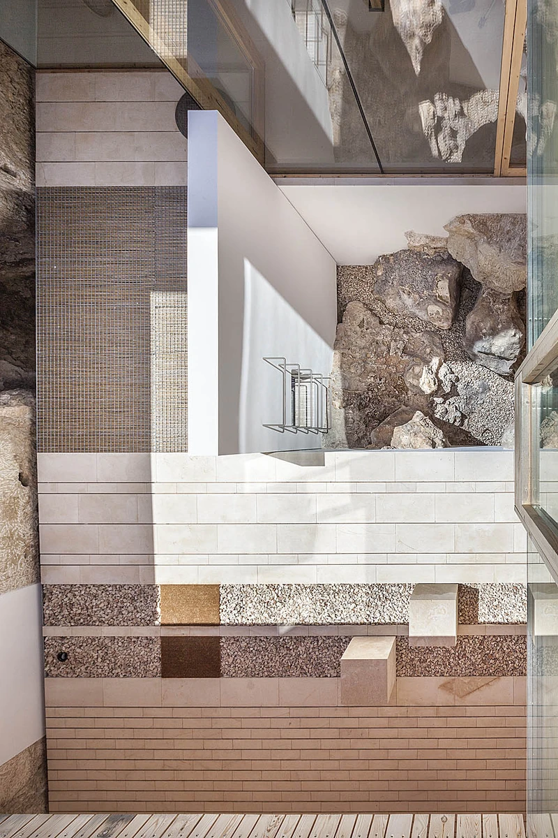 El proyecto se inició «esculpiendo» la roca que aflora en la parcela. Así se obtuvo una planta inferior monolítica, un espacio arquitectónico sobre el que reposan tres módulos paralelos construidos en seco. La alternancia de estas airosas estructuras y los vacíos, así como la sucesión de patios y pasarelas de conexión, le proporcionan un notable dinamismo y una iluminación natural excelente.