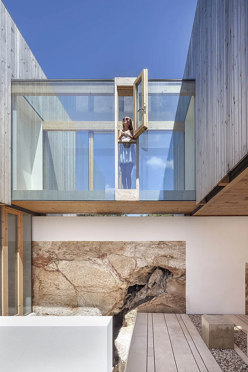 La casa se organiza en tres niveles. Dada la presencia del sustrato rocoso, el inferior no precisó de muros de contención, tan solo de una ligera estructura de hormigón sobre la que descansan los bloques rectangulares de la planta superior. Castelló juega en todos los rincones del edificio con la difuminación de barreras entre interior y exterior. El abundante acristalamiento, la roca vista y un revestimiento de madera que envuelve amplias zonas de la vivienda contribuyen a potenciar esas sensaciones.