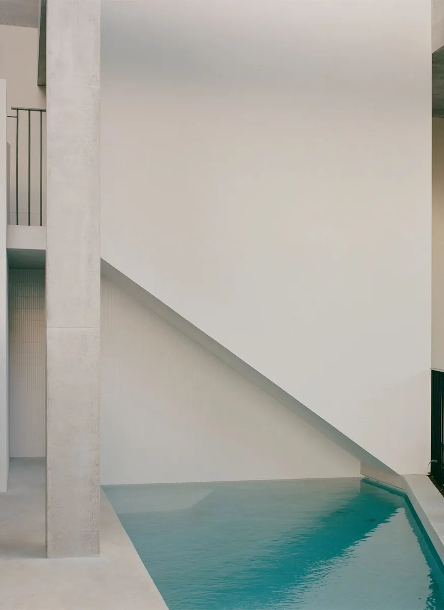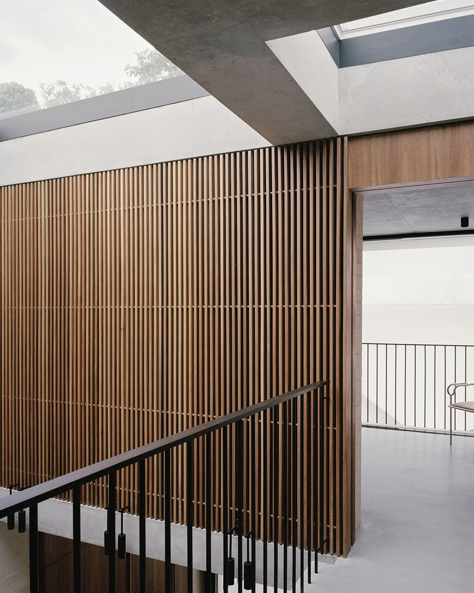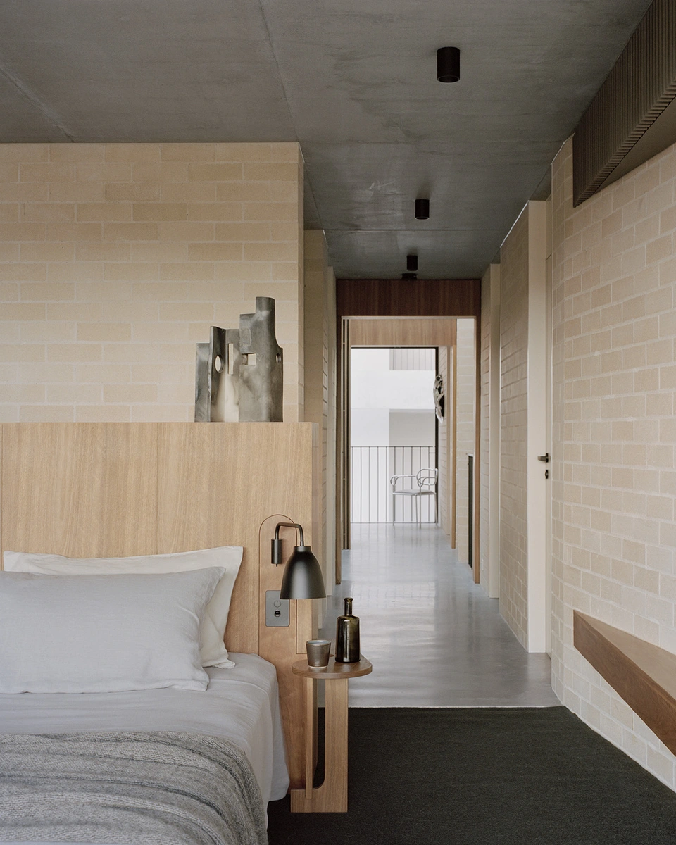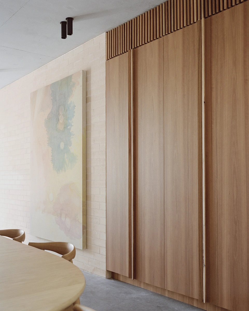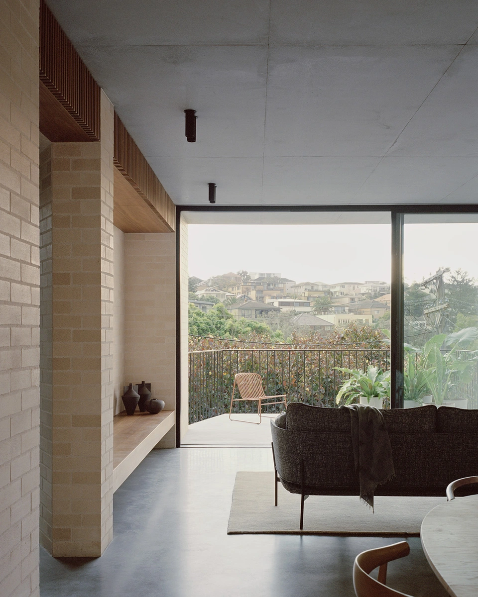 El mobiliario fijo, realizado en madera por Captive Cabinetmaking, refuerza esa continuidad material que da coherencia al conjunto. La vegetación, diseñada por Dangar Barin Smith, se integra sin protagonismo, como una extensión natural de los espacios habitables.