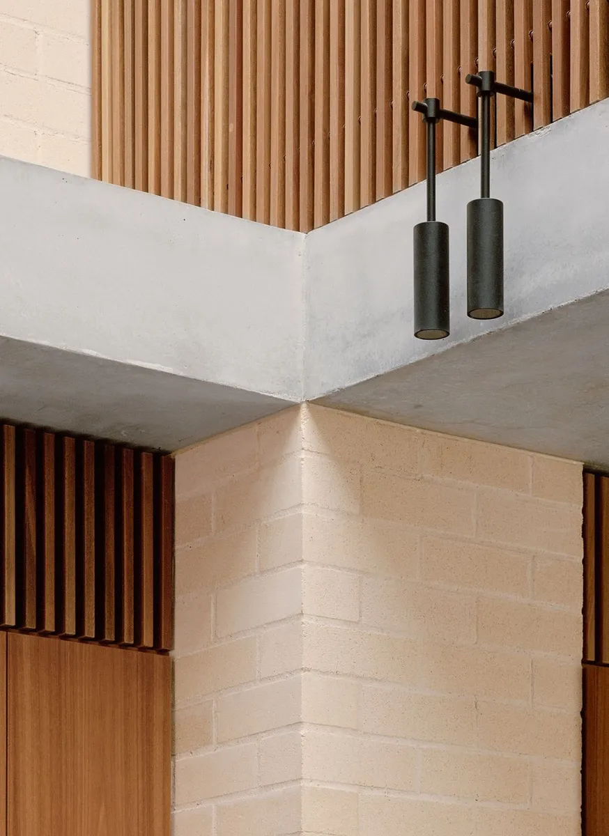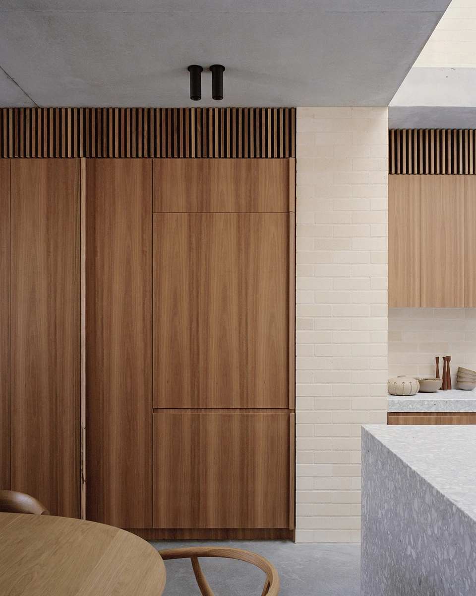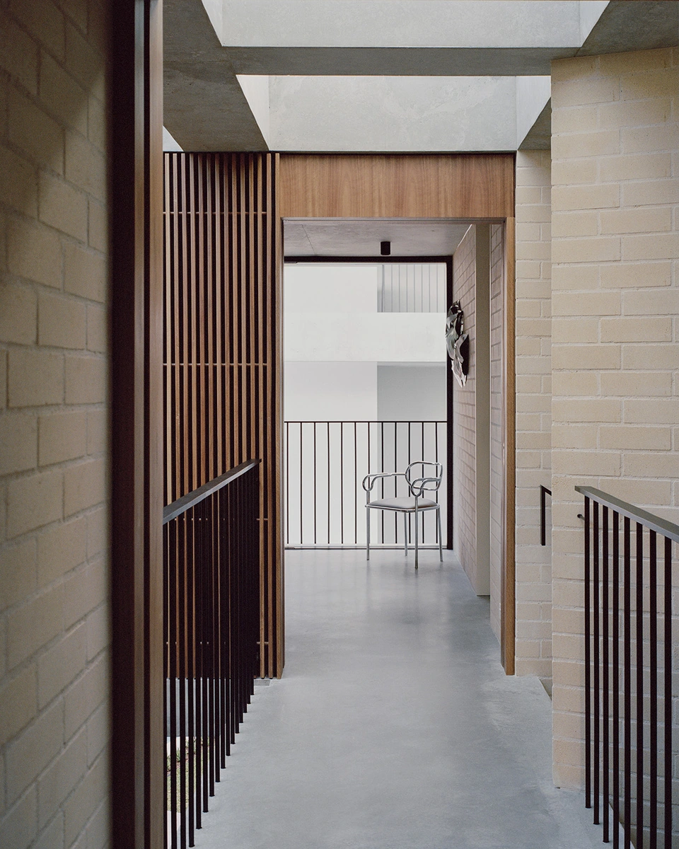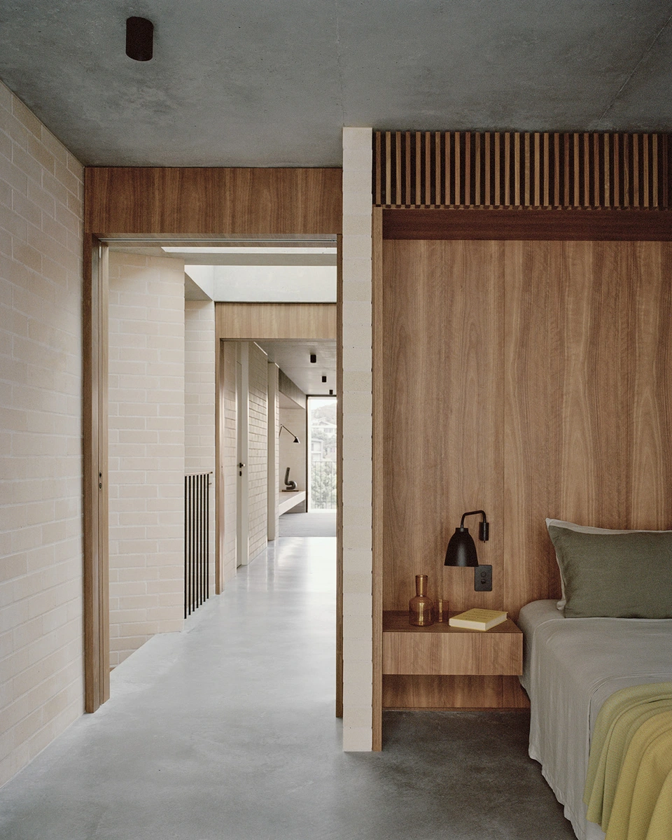 Materialmente, la casa trabaja desde la honestidad. Ladrillo, hormigón, terrazo y madera componen una paleta elemental que conecta con el entorno natural de Bronte. El ladrillo se expresa tanto en fachada como en interior, con soluciones detalladas que lo alejan de la construcción estándar: desde el núcleo central que alberga la escalera, hasta las pantallas de madera y los peldaños de diseño artesanal fabricados por Cranbrook Workshop.
