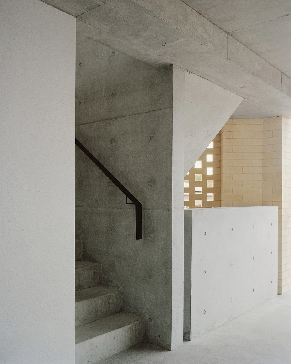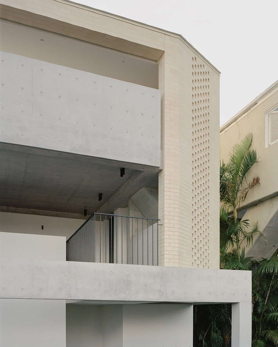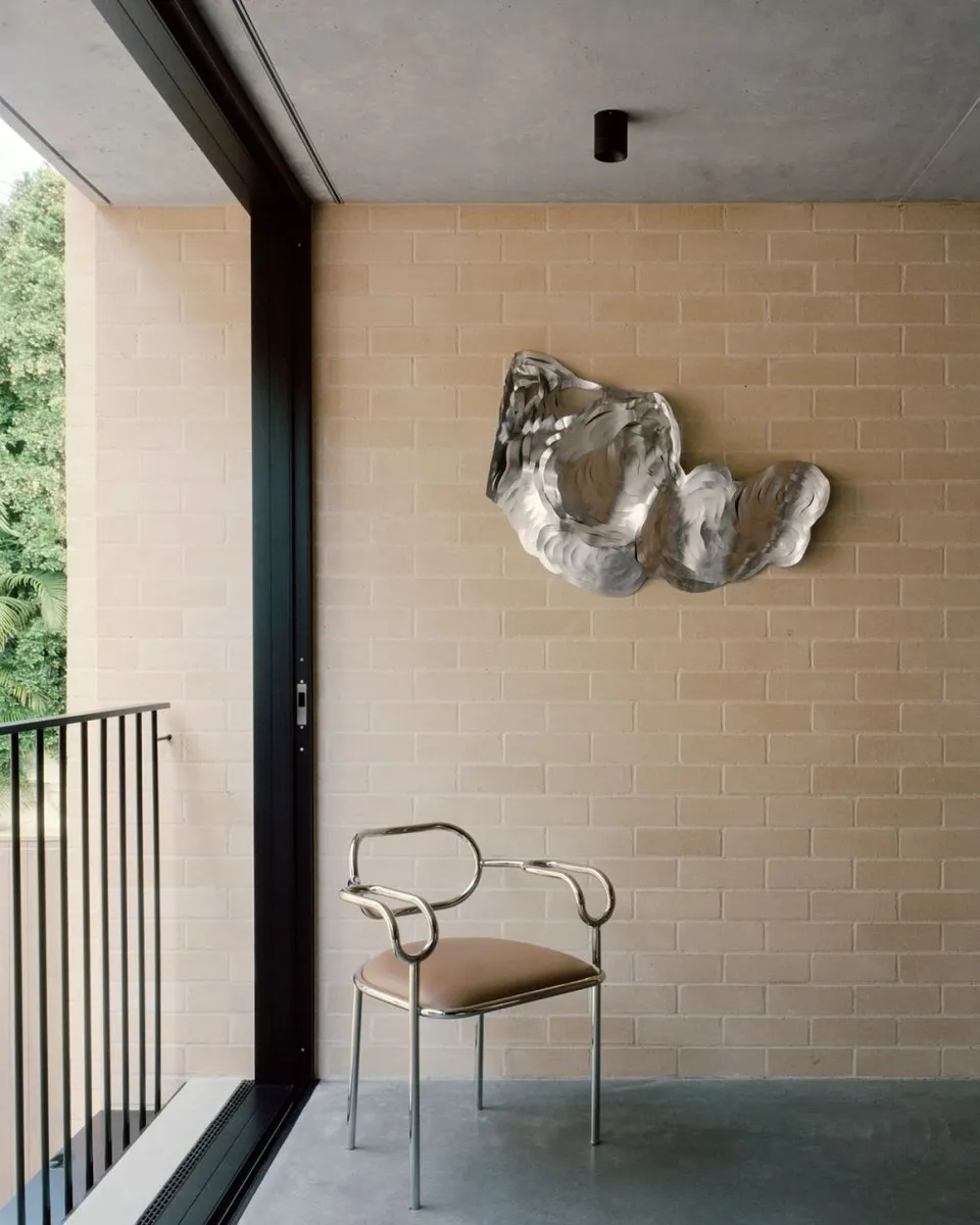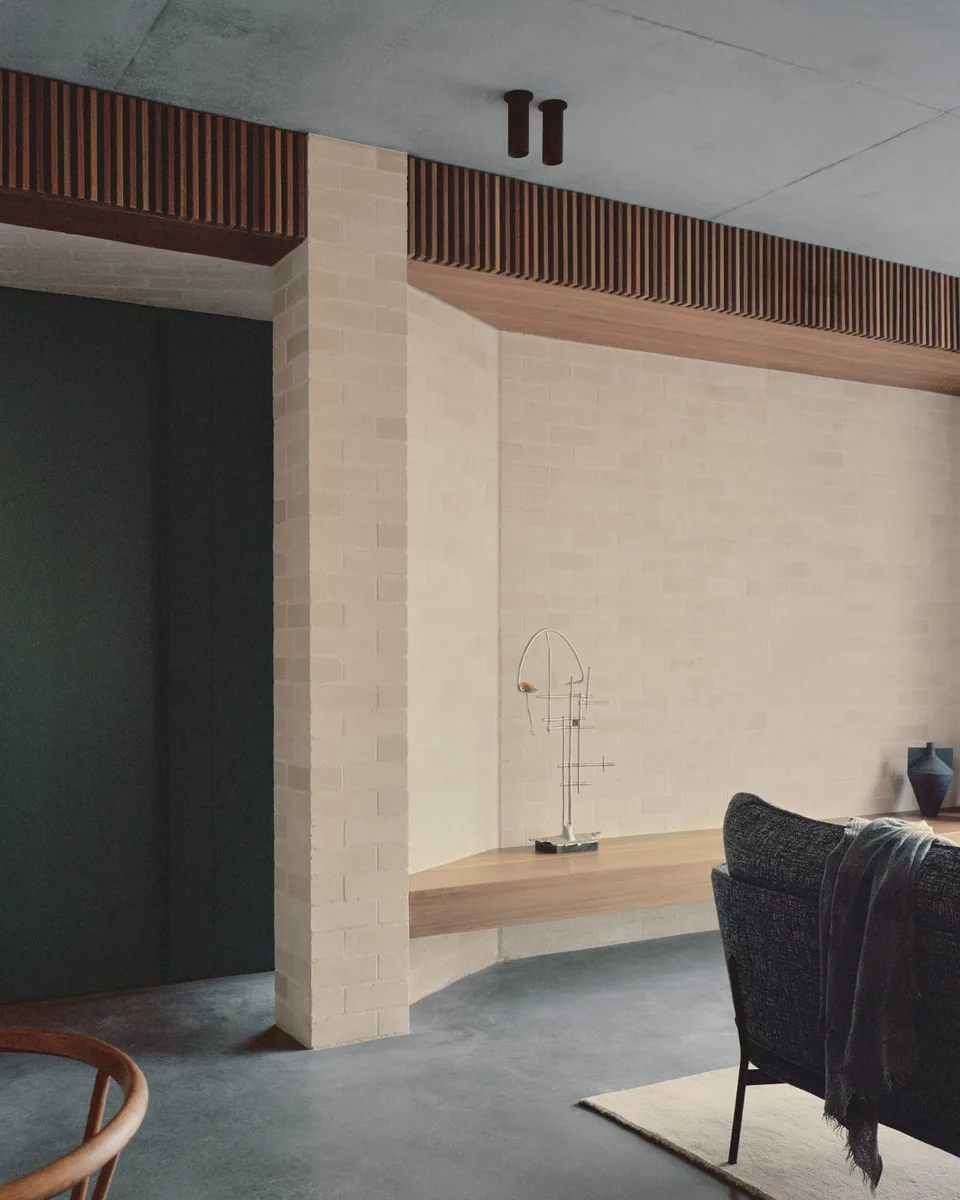 Materialmente, la casa trabaja desde la honestidad. Ladrillo, hormigón, terrazo y madera componen una paleta elemental que conecta con el entorno natural de Bronte. El ladrillo se expresa tanto en fachada como en interior, con soluciones detalladas que lo alejan de la construcción estándar: desde el núcleo central que alberga la escalera, hasta las pantallas de madera y los peldaños de diseño artesanal fabricados por Cranbrook Workshop.