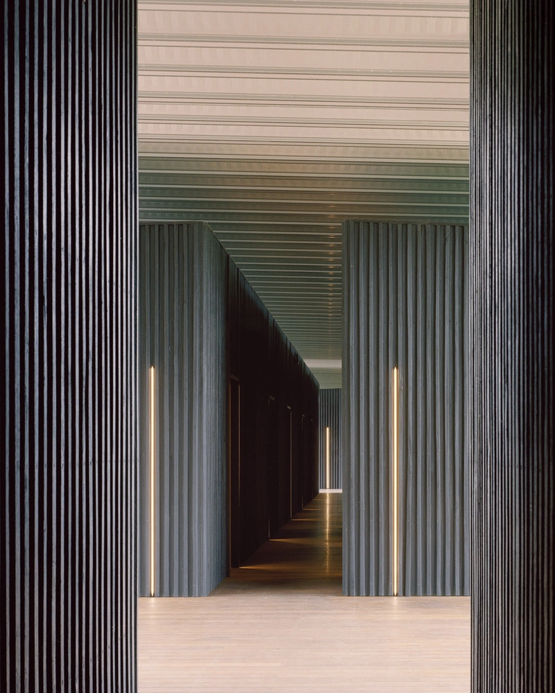 El museo se ha diseñado como una arquitectura resistente al fuego, en gran parte enterrada bajo una loma restituida. El efecto es doble: oculta el volumen y asegura condiciones climáticas estables para albergar la colección artística.