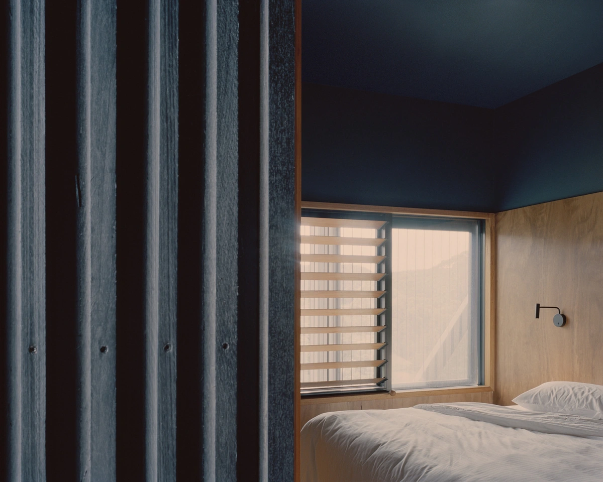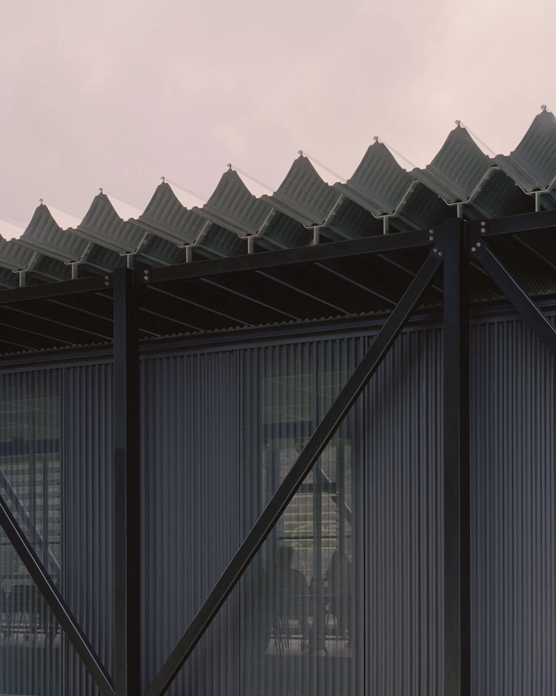 La estructura metálica se apoye con tacto en el terreno: ligeros apoyos que minimizan el impacto y permiten la continuidad visual del paisaje. En su envolvente, se emplea acero oscuro y paneles metálicos corrugados que dialogan con la vegetación circundante.