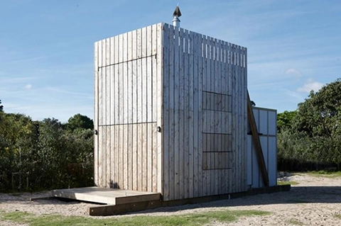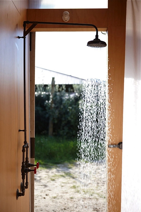 Cuando los clientes no están, la cabaña se cierra completamente para protegerla de los elementos. En el interior, de madera también, los arquitectos utilizaron elementos industriales para sanitarios y griferías. Para abastecerse de agua, la terraza de la cubierta recoge el agua de lluvia que almacena en los tanques de agua correspondientes.