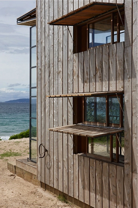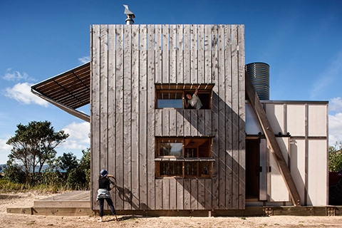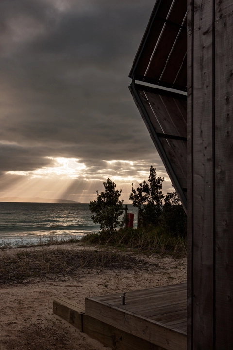 El proyecto se localiza en un área castigada por la erosión de la península de Coromandel donde las vivendas deben ser móviles; la casa es la respuesta al paisaje siempre cambiante que limita con la costa. La cabaña está forrada de madera de Ficus Microcarpa que se mimetiza con el paisaje. De acuerdo con los arquitectos, el refugio cobra vida cuando la gigantesca contraventana de madera situada en el lado nordeste se abre -mediante una gran manivela industrial- formando un toldo.