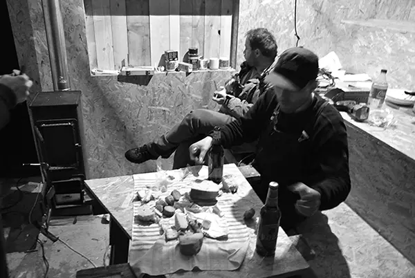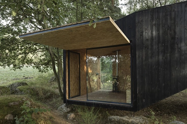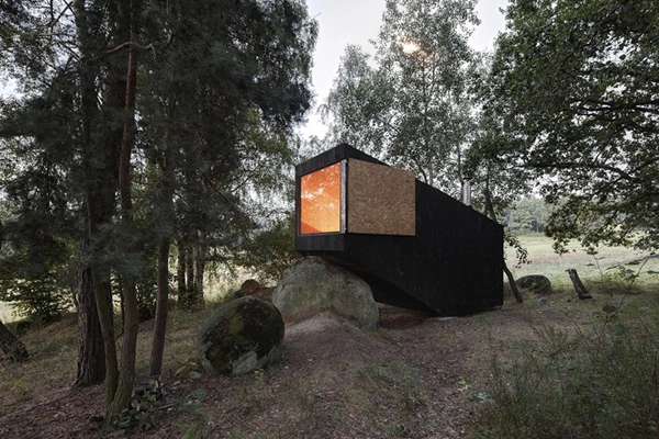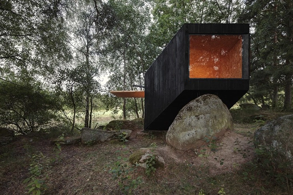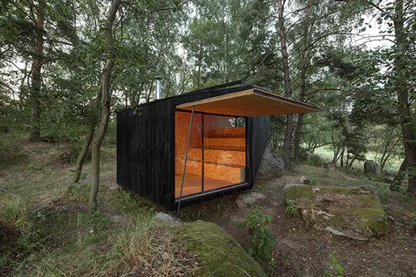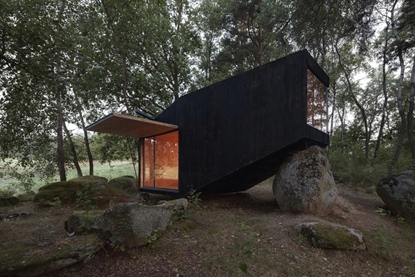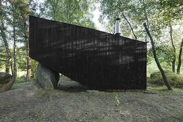 En vez de diseñar una estructura que se ajustara a la fauna existente, los arquitectos desarrollaron un concepto de cabaña con forma de caja, que descansa en angulo recto sobre una inmensa roca, creando un «mirador» elevado. La cabaña se diseñó para un cliente que buscaba un refugio alejado de su ajetreada vida en Praga. Los arquitectos no sólo dibujaron el proyecto, sino que lo construyeron ellos mismos, trabajando en el bosque durante los fines de semana en el otoño de 2012 y la primavera de 2013.