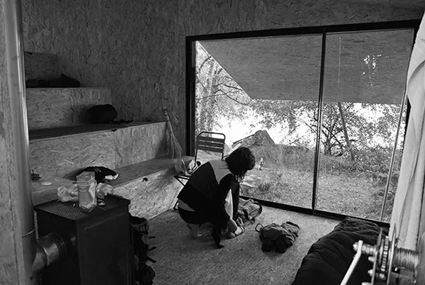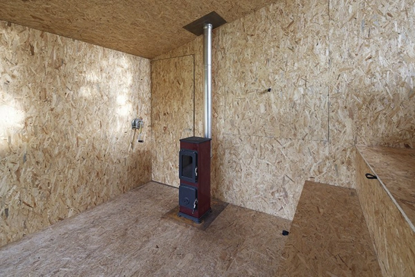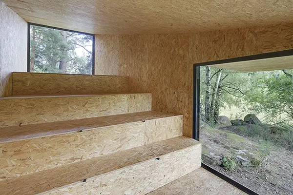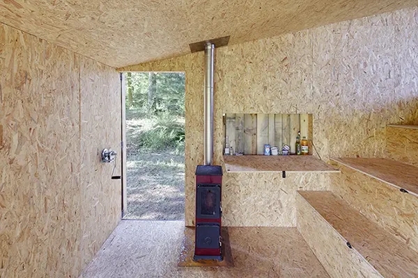 El interior es compacto y está cubierto de tableros de virutas orientadas (OSB), un producto de madera similar al contrachapado. Este material se eligió por su dureza y como refuerzo de la estructura, además de por su bajo precio. Los escalones de acceso a la gran ventana sirven de almacenaje y zona de dormir: un escalón se convierte en una cama doble. La entrada a la cabaña se hace a través de una puerta a nivel del suelo que abre hacia un espacio pequeño y recto, con apenas espacio libre sobre la cabeza para una persona de pie. El interior no mide más de 200m2. Está dividido en 2 areas, una que se usa como zona de comer y la otra es una serie de escalones que se pliegan para crear asientos flexibles, zona de dormir y almacenaje. El espacio multifuncional sirve como vivienda, pequeñas reuniones, actuaciones o simplemente, para meditar.